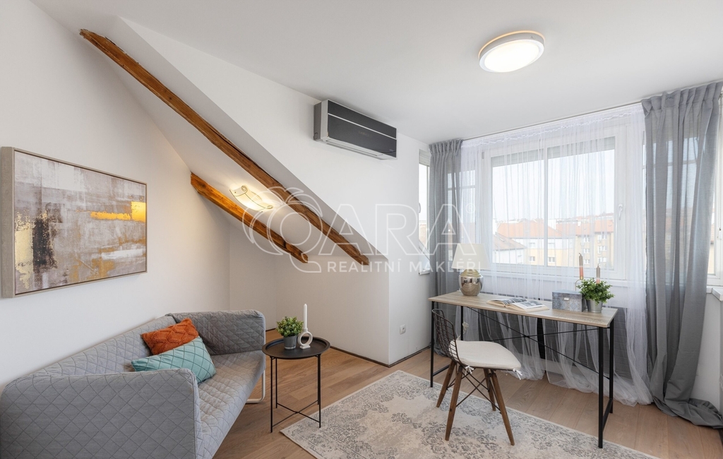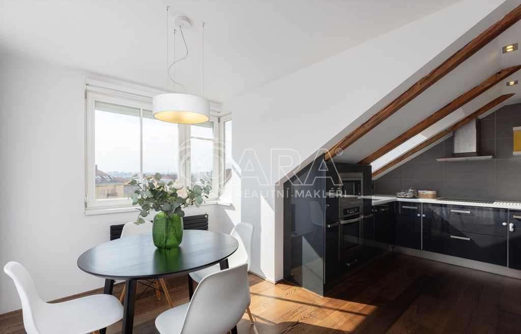 Zapomeňte na stereotypní podkrovní byty s nízkými stropy. Tohle je prostor, kde se můžete nadechnout. Na ploše 146 m² se rozkládá byt, který v sobě snoubí moderní design a praktičnost. Díky výtahu, který vás doveze až do vaší předsíně pomocí čipu, si užijete maximální komfort a soukromí. Pro hosty je k dispozici video telefon a schodiště, které můžete využít pro dodatečný úložný prostor.