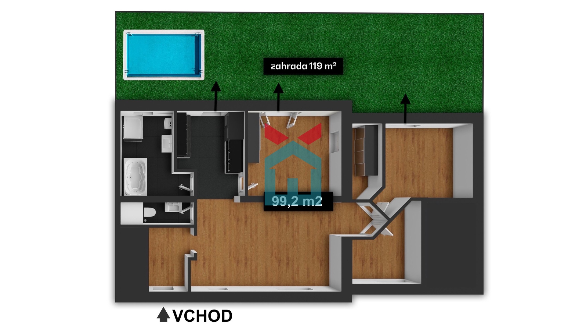 Tato jednotka nabízí komfortní dispoziční řešení s prostornou chodbou, samostatným WC, koupelnou, kuchyní, obývacím pokojem, pokojem, ložnicí se šatnou a samostatnou pracovnou. K jednotce dále náleží komfortní uzavřená zahrada s bazénem o rozloze 119 m²