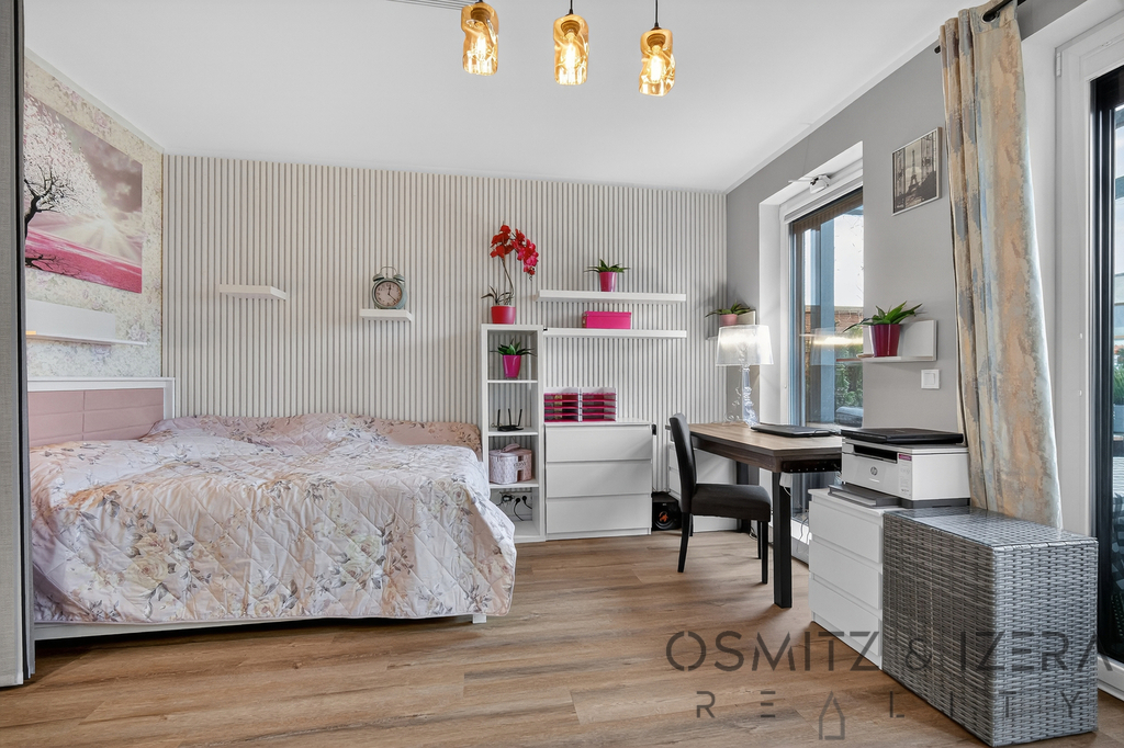 Byt v moderním designu lze snadno příčkou upravit na 2kk. Aktuálně jej tvoří prostorný obývací pokoj s kuchyní, ložnice oddělená japonskými stěnami a menší pracovna.