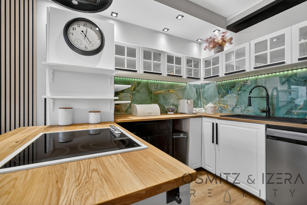 • Kuchyně: Tvar „U“, ostrůvek se sklokeramickou deskou, vestavěné spotřebiče (americká lednice, horkovzdušná trouba, myčka, digestoř, dřez Franke), skleněné obklady a snížený strop s bodovými světly.