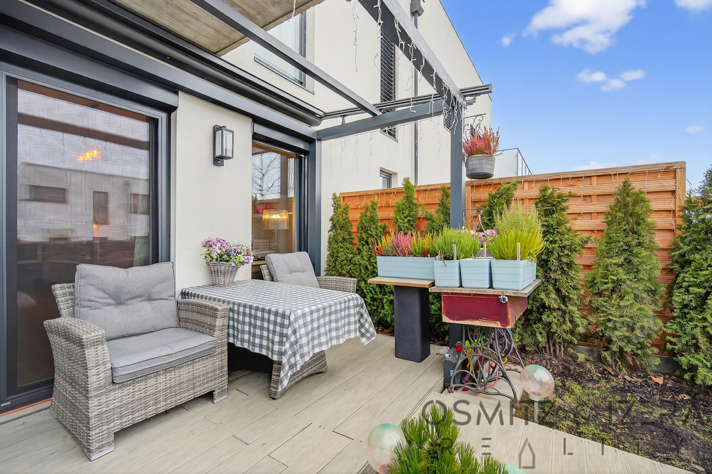 Slunná zahrada (JV) s terasou je v osobním vlastnictví a nabízí naprosté soukromí díky 3 metry vysokému gabionovému plotu.