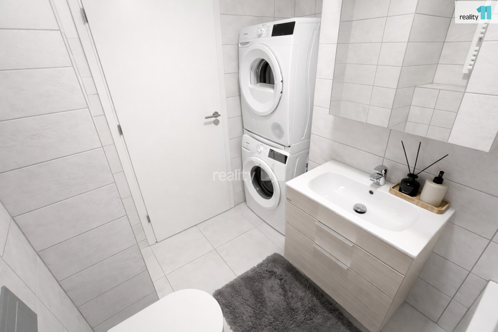 Byt je dispozičně řešen jako 2kk a působí světlým, moderním a velmi praktickým dojmem. Už při vstupu vás přivítá prostorná předsíň s vestavěnými skříněmi na míru, které poskytují dostatek úložných prostor a podtrhují čistý, uspořádaný charakter interiéru. Z předsíně je přímý vstup do koupelny s WC, vybavené vanou, umyvadlem a šikovně řešeným koutem pro pračku a sušičku.