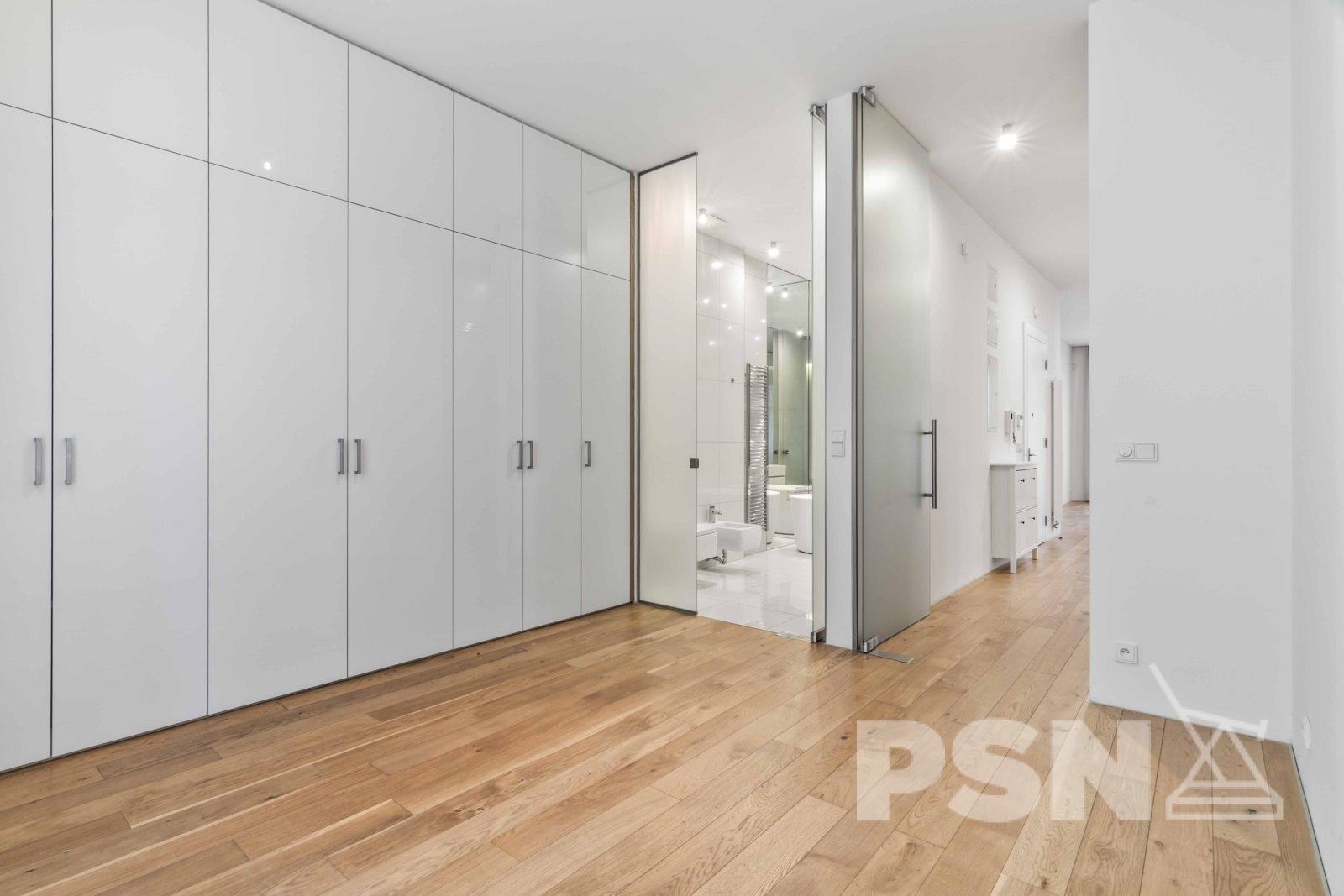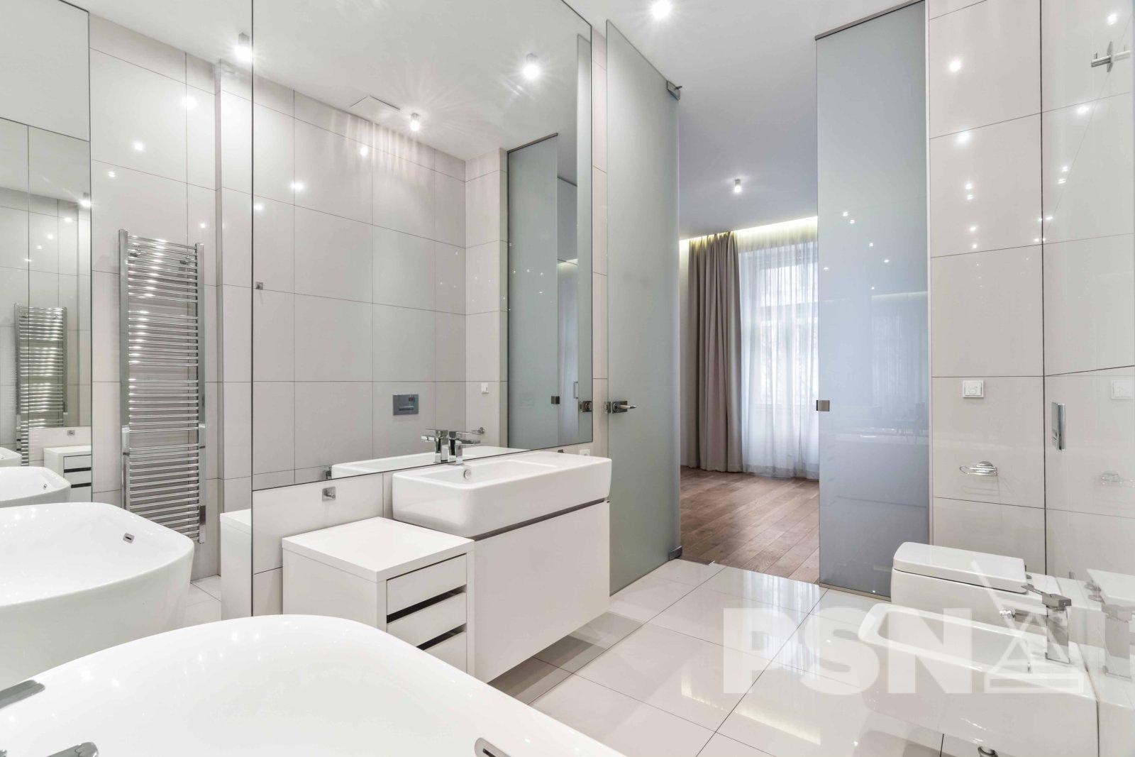 Hlavní část bytu představuje prostorný obývací pokoj s kuchyňskou linkou s vestavěnými spotřebiči v nadčasovém provedení a přímým vstupem na terasu. Dispozice dále zahrnuje dvě ložnice, koupelnu s vanou a toaletou a druhou koupelnu se sprchovým koutem a toaletou. Praktické uspořádání poskytuje komfortní zázemí pro každodenní život.