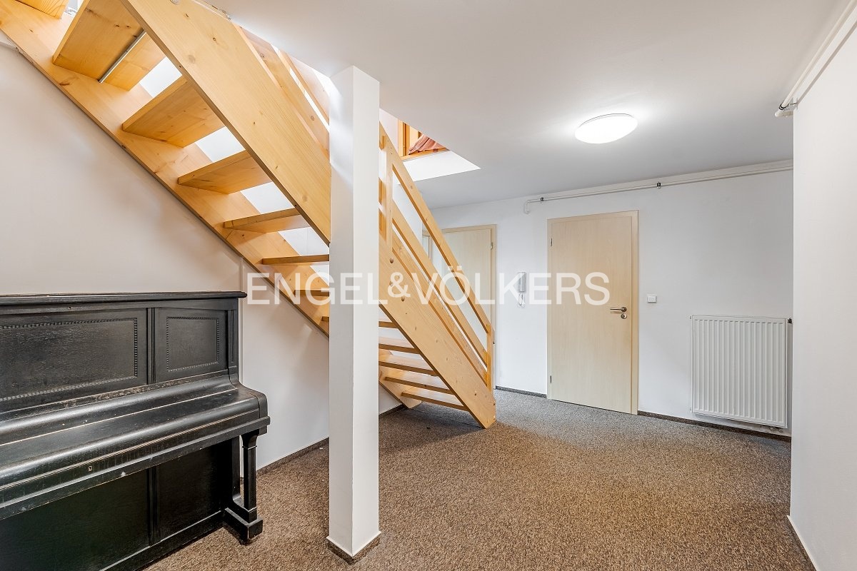 Dřevěné schodiště vede do horního podlaží, kde se nachází prostorná místnost s širokými možnostmi využití – ideální například jako pracovna, ateliér nebo zóna pro odpočinek.