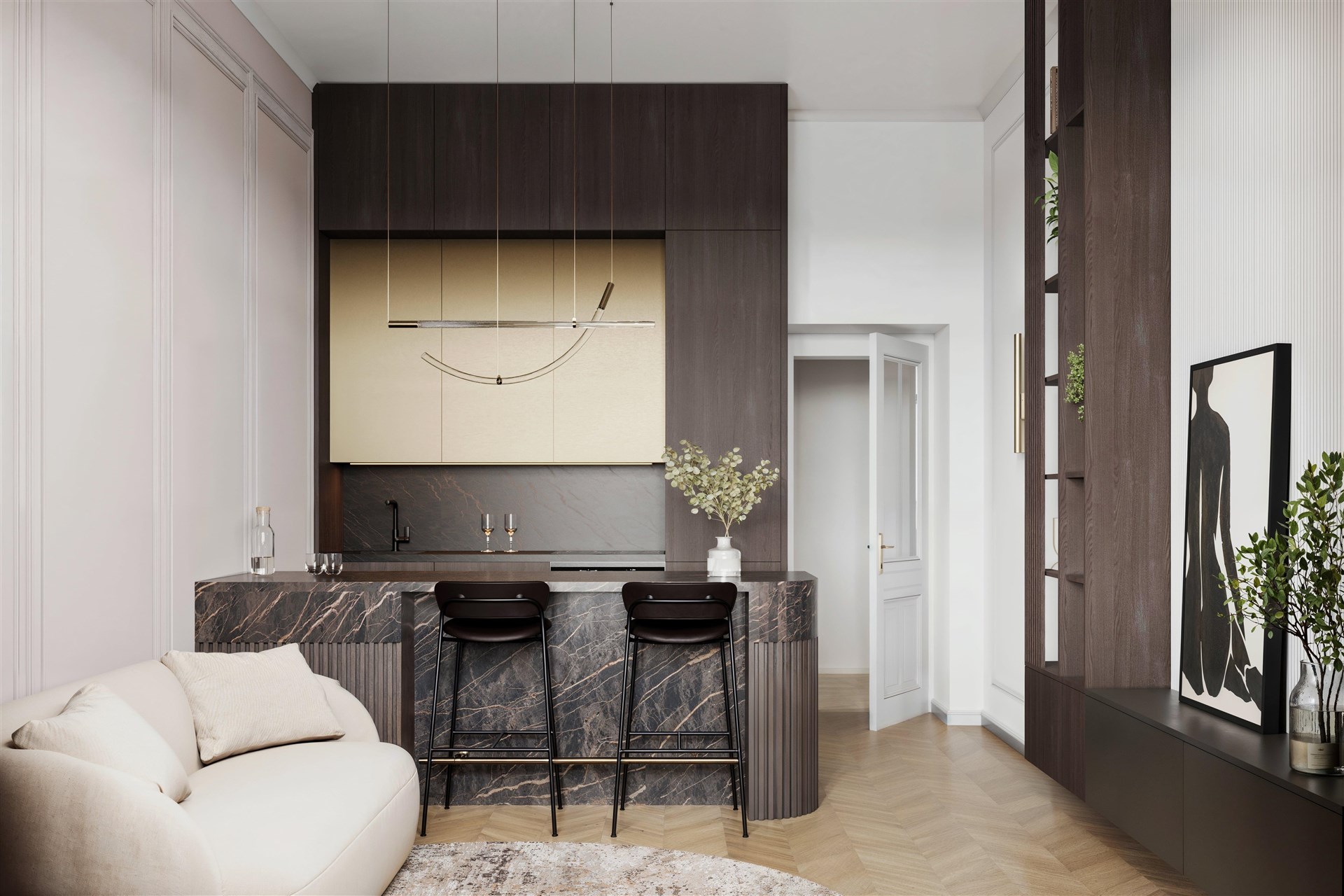 - Ve společných prostorech jsou použity materiály jako terazzo, broušené sklo či benátské štuky