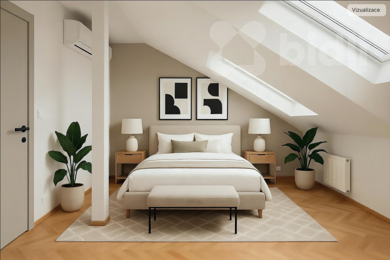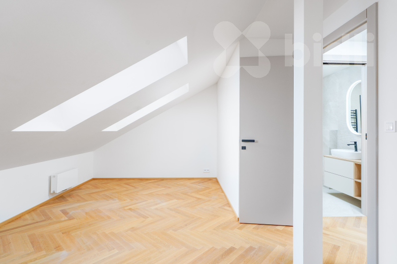 Ložnice je situována na východní stranu s výhledem do klidného parku, což zajišťuje nerušený odpočinek. Místnost je prosvětlena kvalitními střešními okny. Dispozici doplňuje moderní koupelna se sprchovým koutem a toaletou a vstupní chodba. Byt je díky své oboustranné orientaci (východ-západ) vzdušný a světlý.