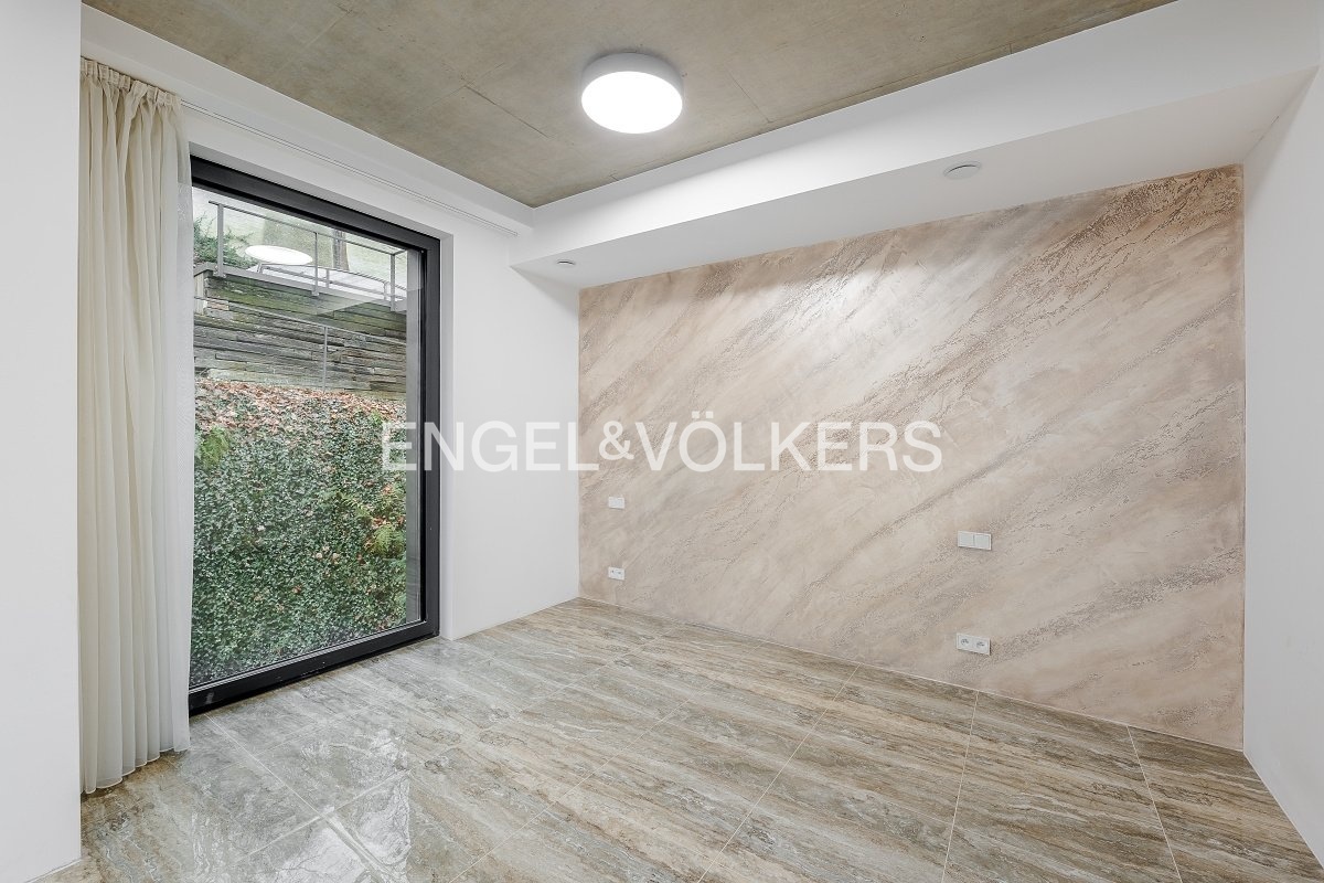 Interiér bytu tvoří vstupní hala se vstupem do obývacího pokoje s moderním kuchyňským koutem se spotřebiči. Obývací pokoj volně navazuje na spací kout. V koupelně se nachází vana, sprchový kout a toaleta. Celý byt je vybaven podlahovým vytápěním, kterým lze i chladit. Zároveň je v bytě i rekuperační jednotka.