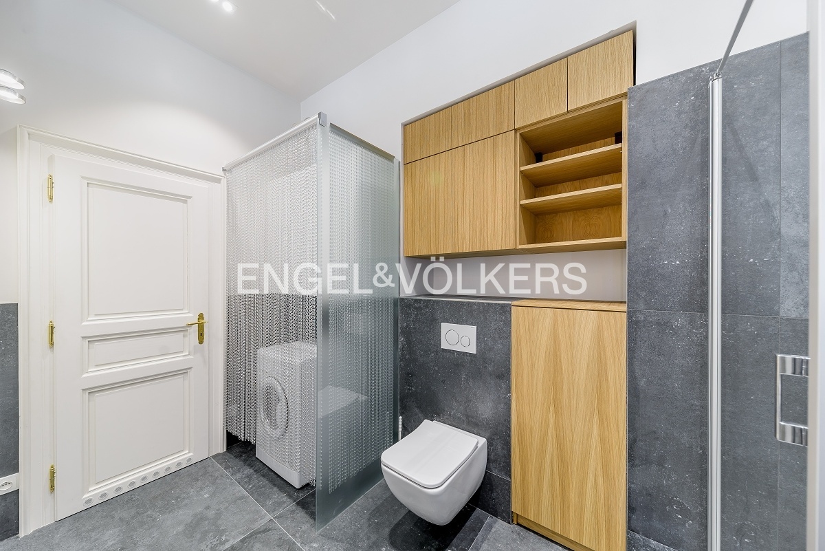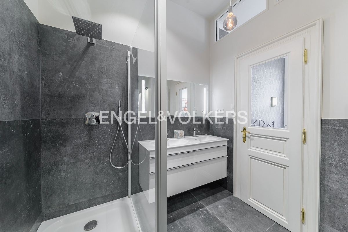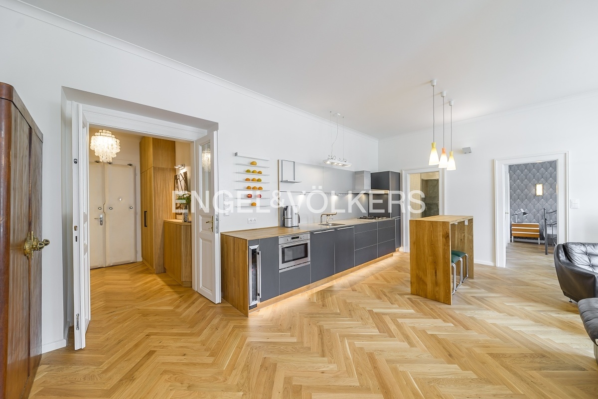 Designový nábytek a vybavení, masivní dřevěné podlahy, bezpečnostní vstupní dveře, luxusní německá kuchyň zn. Bulthaup, myčka, malá vinotéka, přídavný kohoutek s vroucí vodou zn. Quooker, sanita zn. Grohe a Villeroy&Boch.