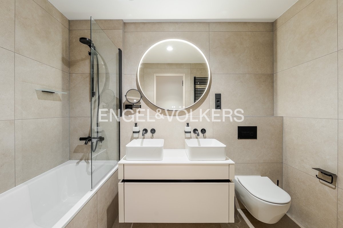 Dispozice zahrnuje světlý obývací pokoj s jižní orientací a luxusní kuchyňskou linkou na míru se spotřebiči Miele včetně vinotéky, hlavní ložnici s prostornou šatnou a vlastní prádelnou, druhou ložnici vhodnou také jako pracovnu či pokoj pro hosty a dvě velké koupelny – jedna s vanou a sprchou, druhá s prostorným sprchovým koutem.