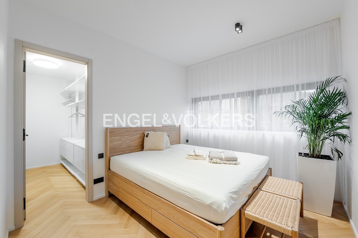 Byt je vybaven stropním vytápěním a chlazením, centrálním větráním s rekuperací, venkovními žaluziemi, dřevěnými podlahami a chytrou domácností Loxone. Součástí nájmu je kvalitní a nadstandardní vybavení bytu, včetně nové pračky a sušičky značky Miele, masivní postele a televize.