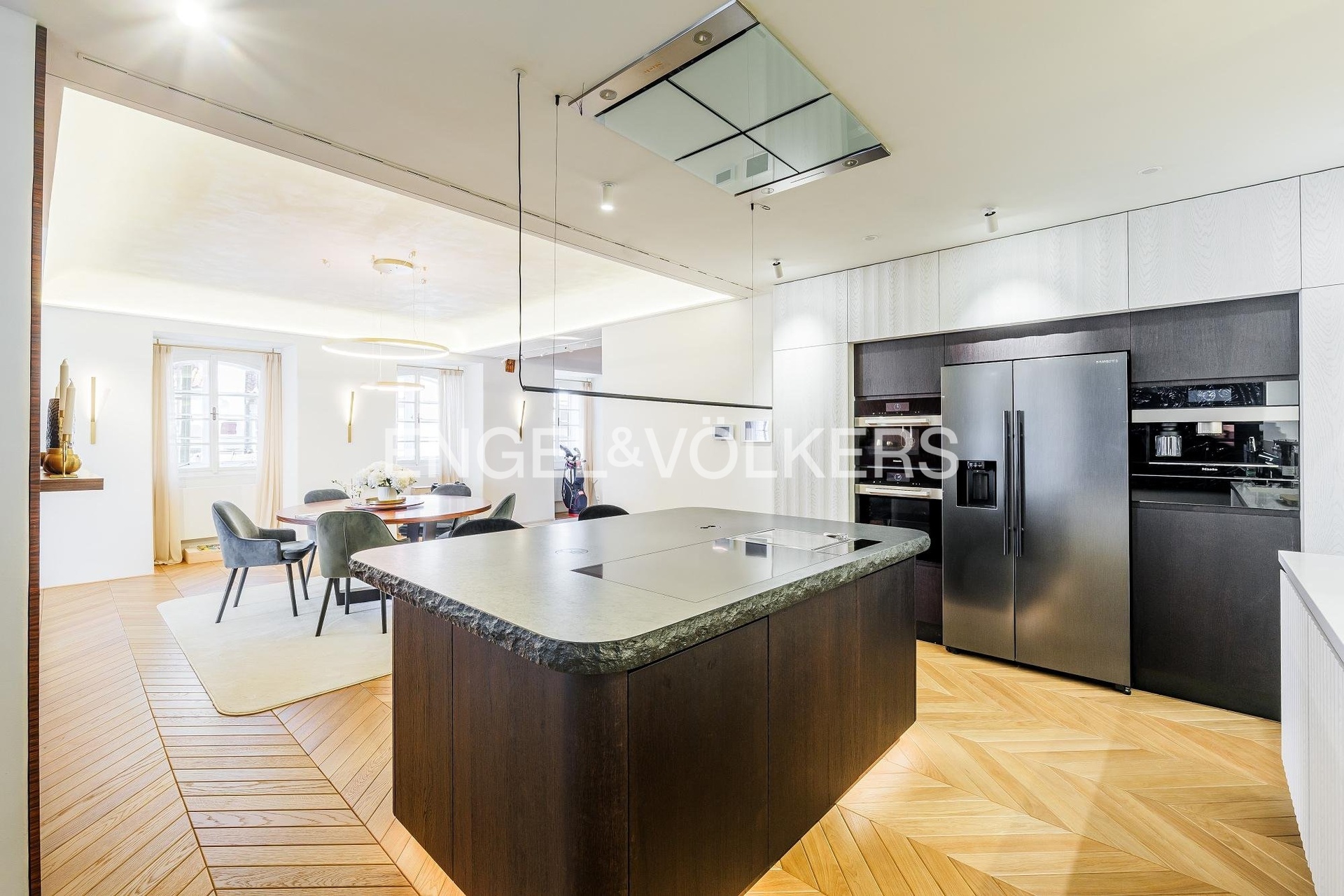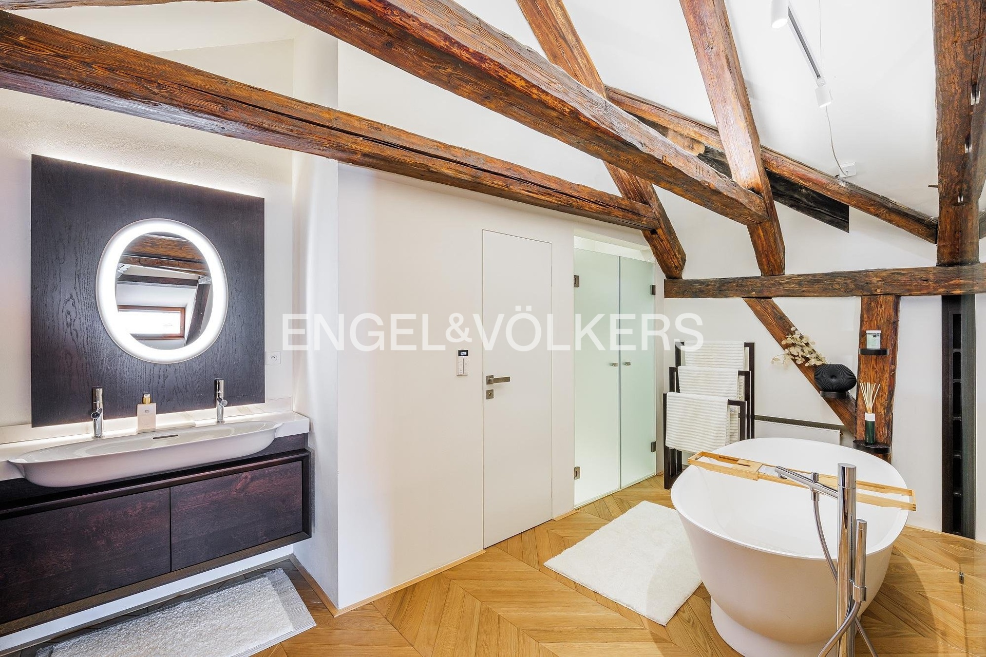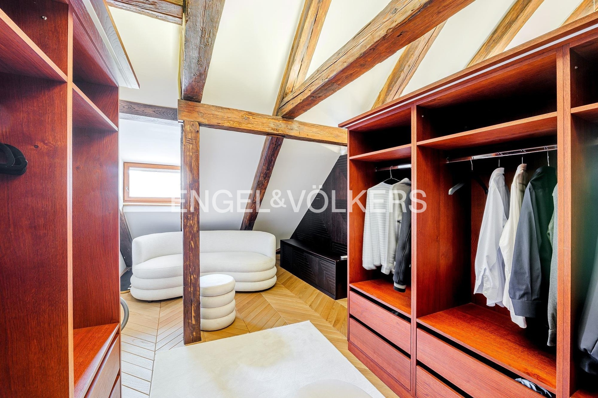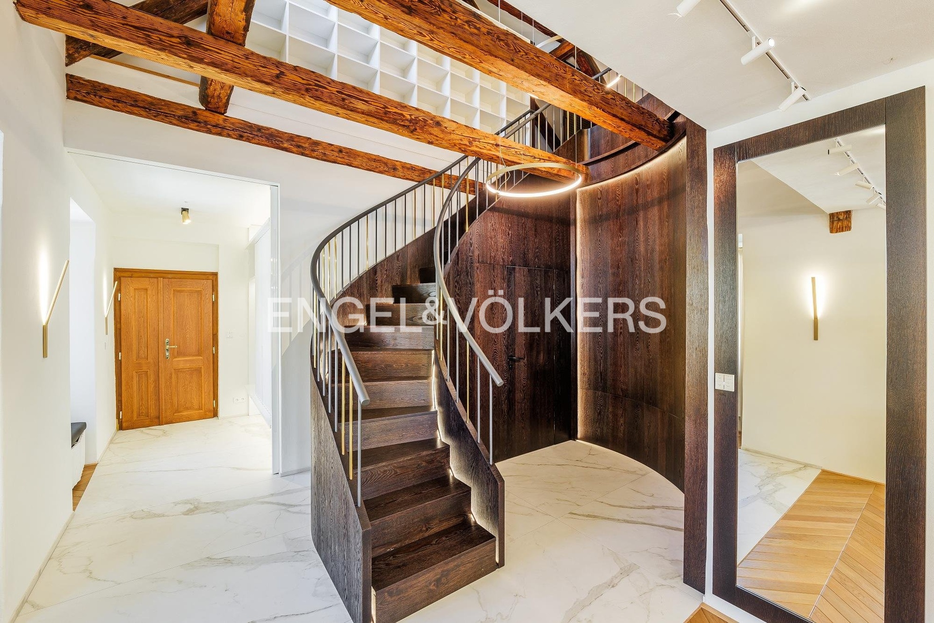 Dispozice 2+kk se rozkládá na neuvěřitelných 165 m2 vnitřní užitné plochy. Byt je po kompletní a velmi nákladné rekonstrukci z roku 2020-2022, pro kterou byly použity materiály nejvyššího standardu. V prvním patře naleznete vstupní chodbu s vestavěným úložným prostorem, koupelnu se sprchovým koutem, otevřenou kuchyni s jídelnou, obývací část s posezením a prosklenou vinotékou. Druhé patro disponuje samostatnou šatnou, ložnicí a otevřenou koupelnou s vanou i sprchovým koutem.