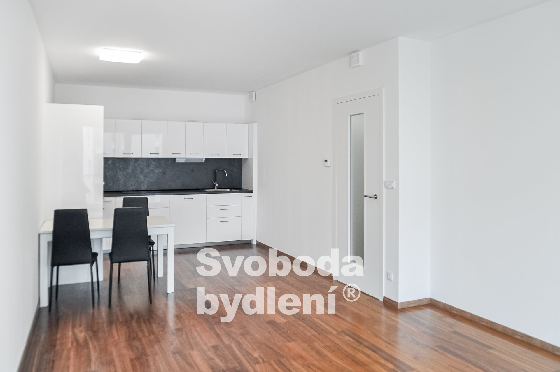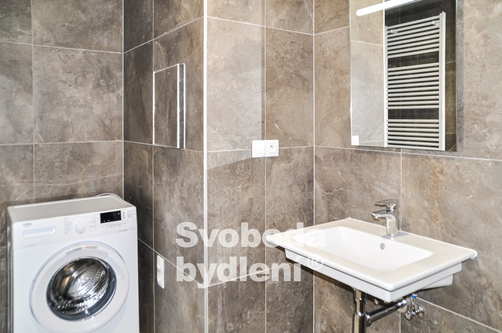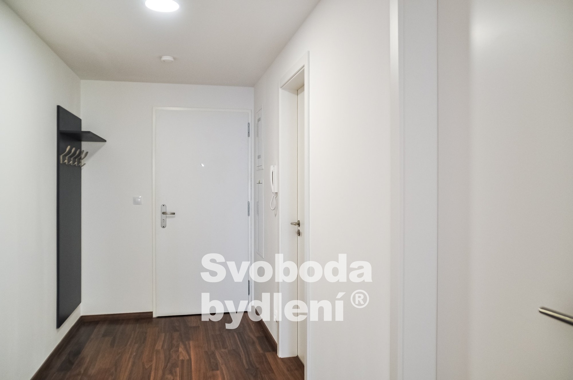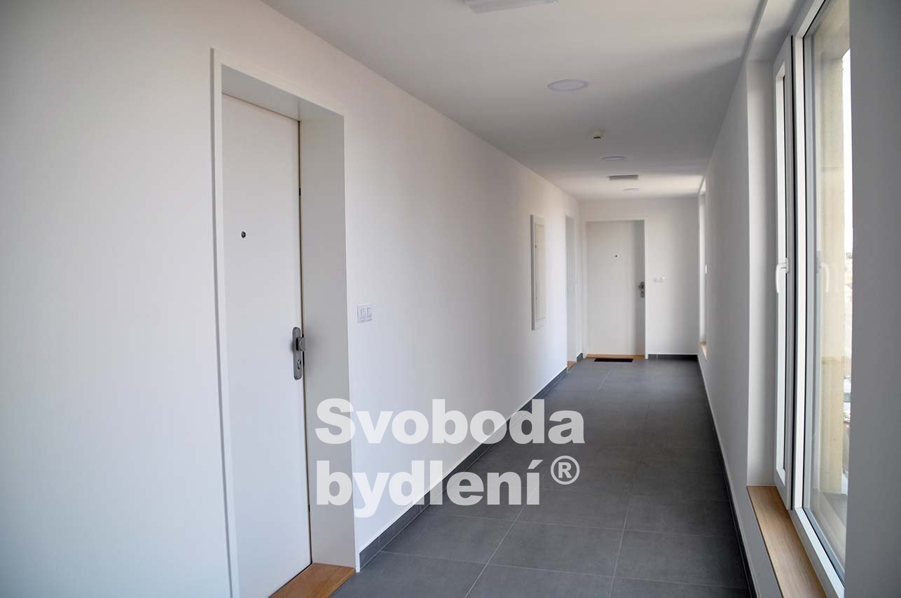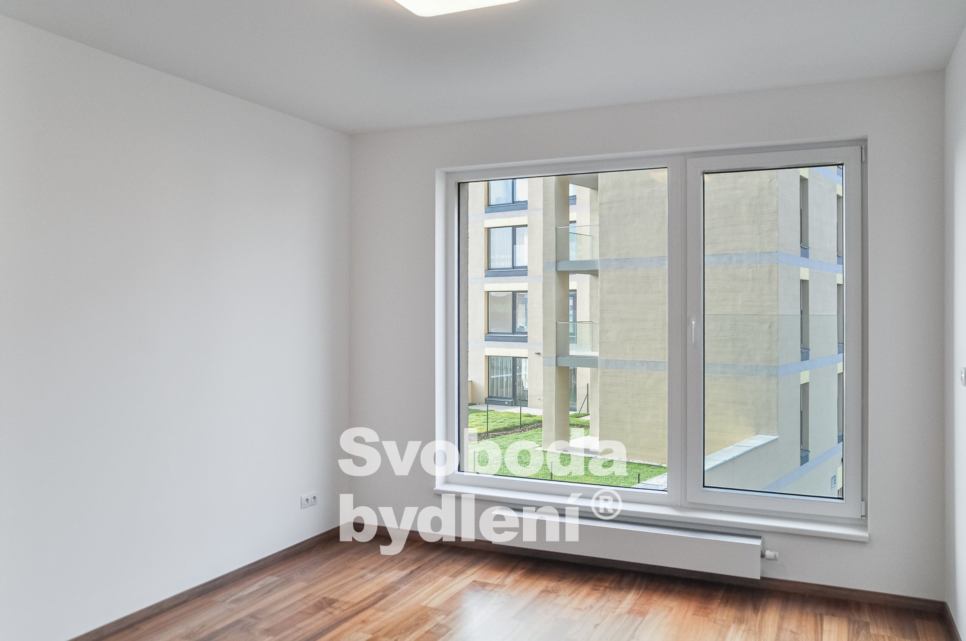 Světlý obývací pokoj disponuje moderní luxusní kuchyňskou linkou, jež je vybavena všemi potřebnými spotřebiči (varná deska, elektrická a mikrovlnná trouba, lednice, myčka). Je zde také dostatek prostoru pro jídelní stůl. Francouzskými dveřmi vejdeme na balkón, jenž je orientován na západ do klidové zóny vnitrobloku. Vstupní chodba je vybavena věšákem. Koupelna nabízí komfort vany, je zařízena umyvadlem se zrcadlem a topným žebříkem, je zde instalována také pračka. Vysoký komfort zajišťují kvalitní materiály a zařizovací předměty v podobě např. velkoformátových italských obkladů či sanitární keramiky Villeroy Boch. Nedílnou součástí vyššího standardu bydlení je také systém rekuperace, jenž umožňuje větrání v obytných místnostech bez nutnosti otevírání oken, což zabraňuje nežádoucímu úniku tepla a zachování zvukové pohody v interiéru. Na podlahách je položena dřevěná podlaha.