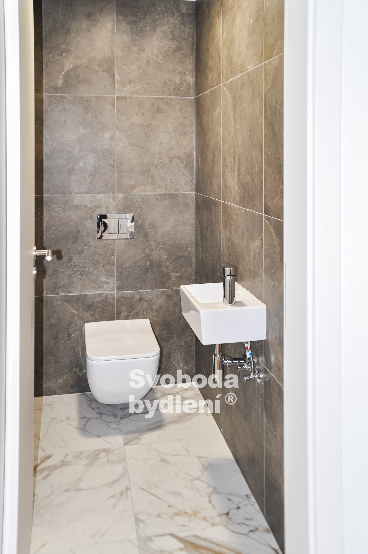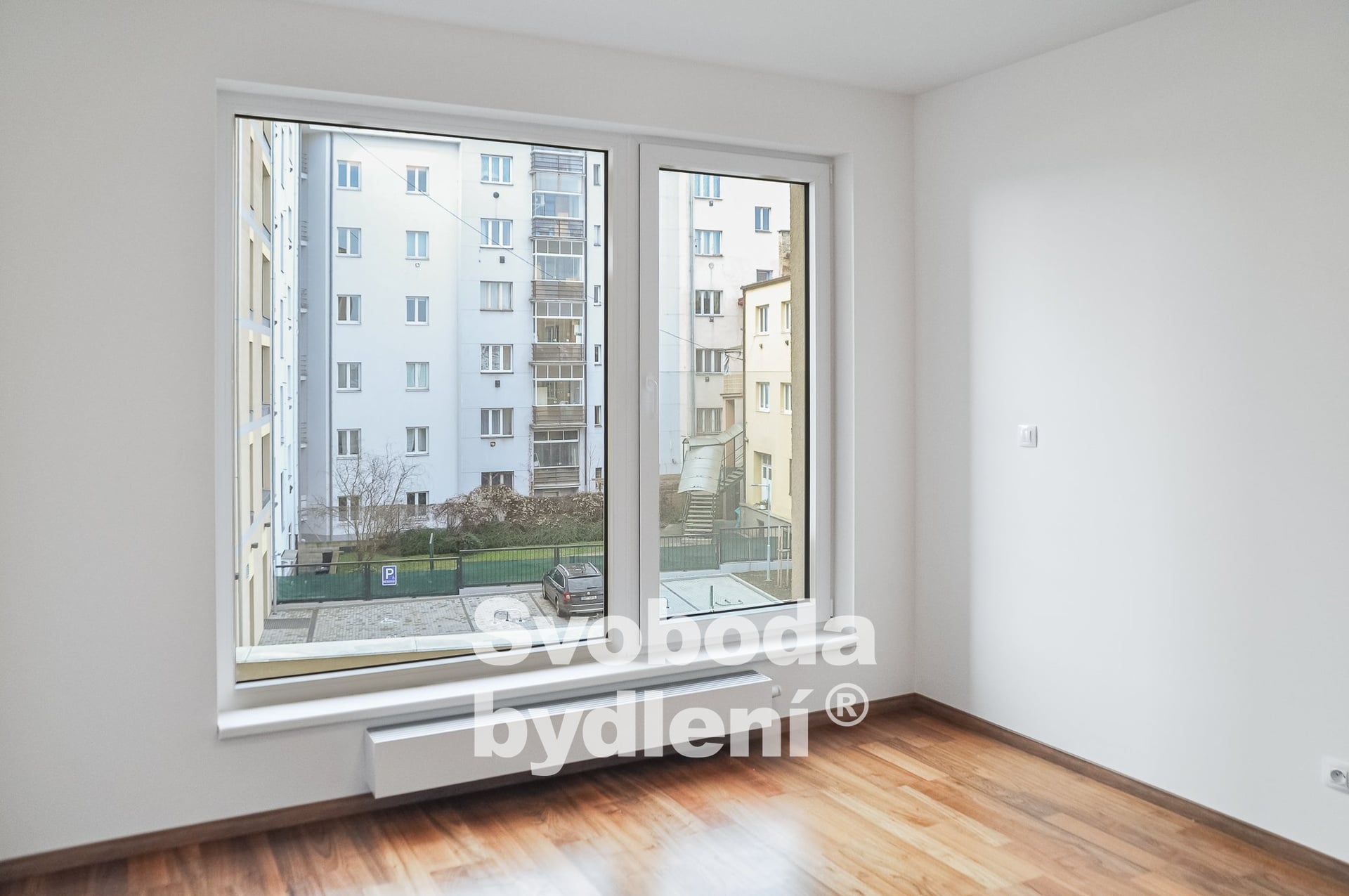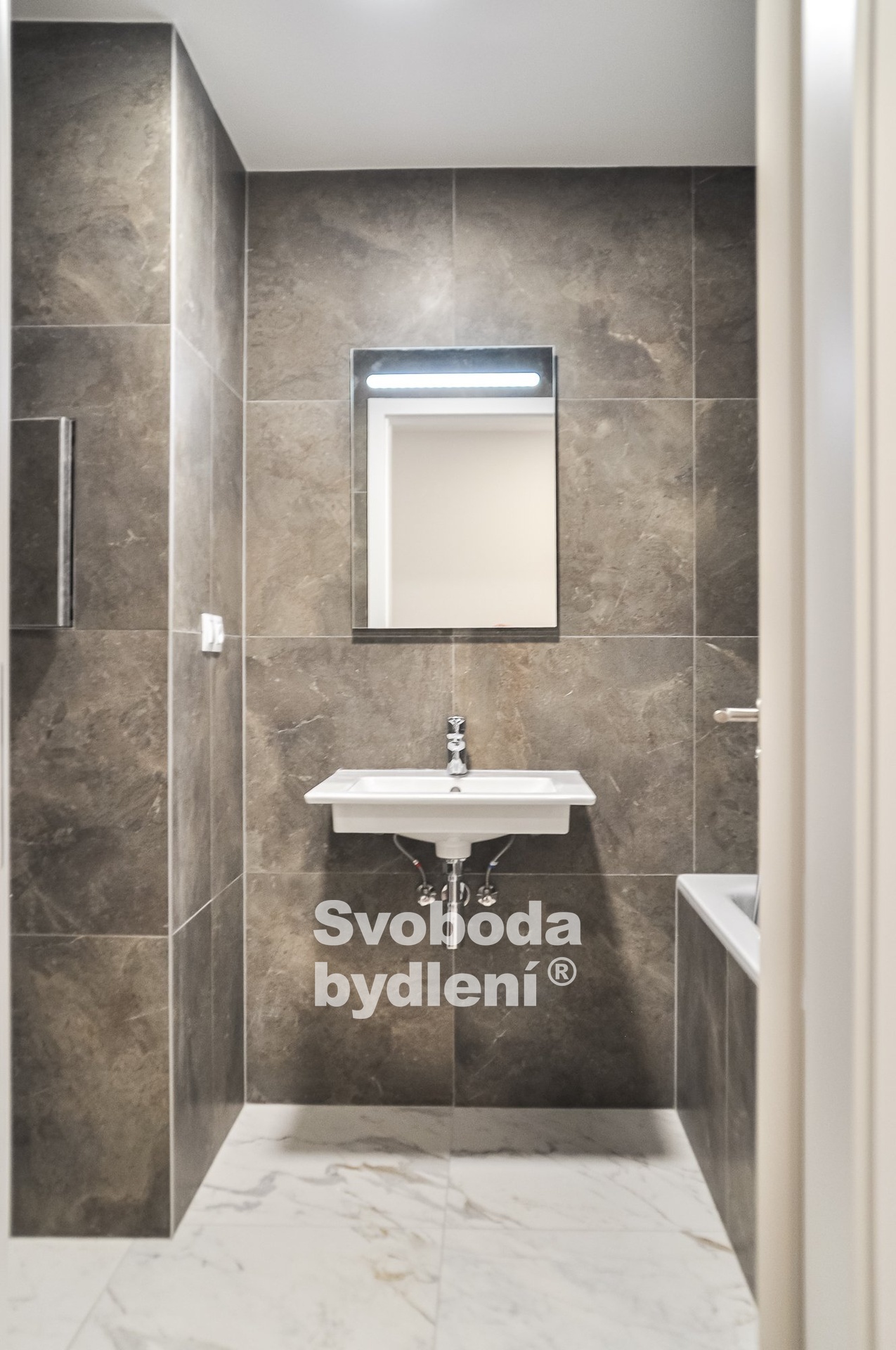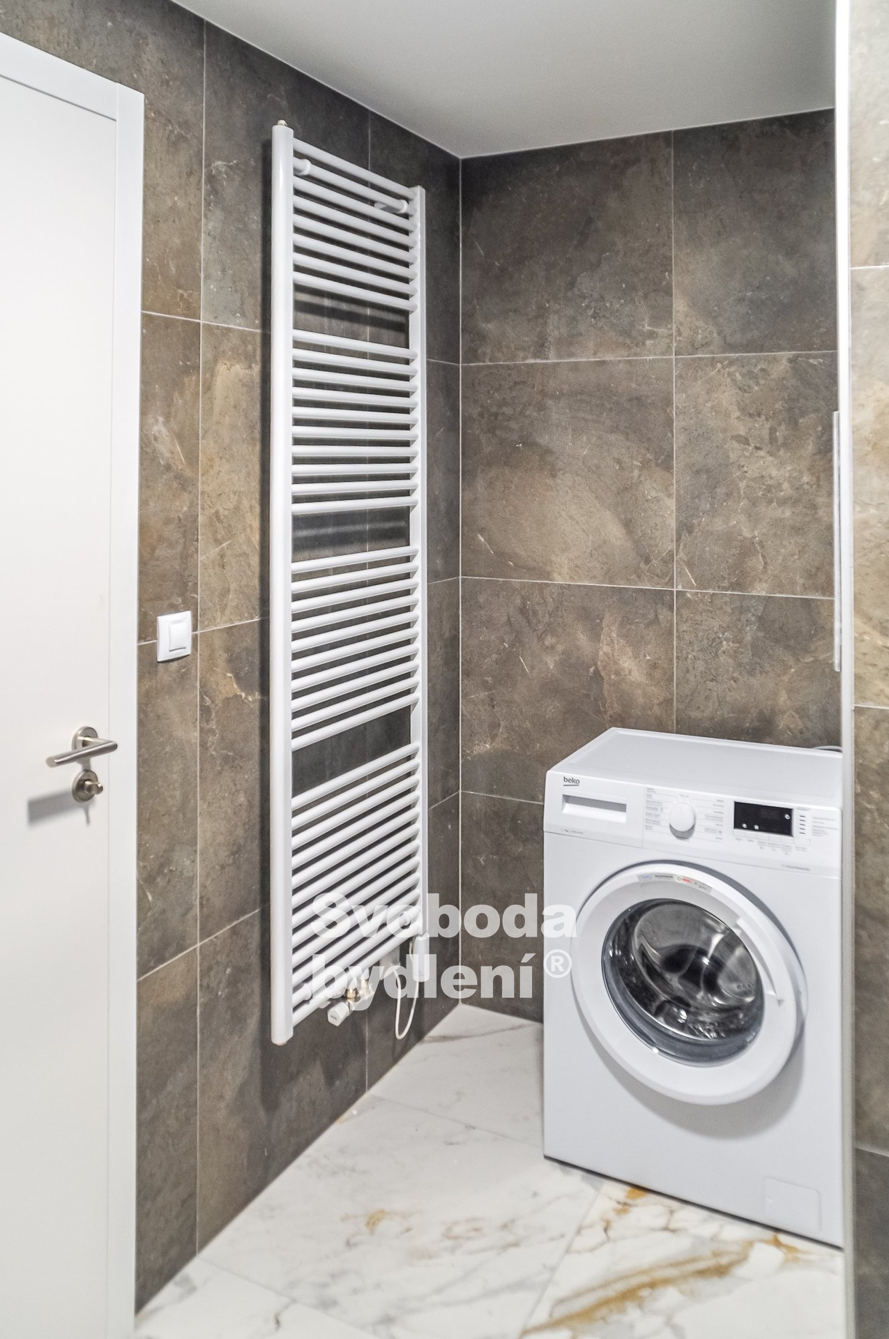 Světlý obývací pokoj disponuje moderní luxusní kuchyňskou linkou, jež je vybavena všemi potřebnými spotřebiči (varná deska, elektrická a mikrovlnná trouba, lednice, myčka). Je zde také dostatek prostoru pro jídelní stůl. Francouzskými dveřmi vejdeme na balkón, jenž je orientován na západ do klidové zóny vnitrobloku. Vstupní chodba je vybavena věšákem. Koupelna nabízí komfort vany, je zařízena umyvadlem se zrcadlem a topným žebříkem, je zde instalována také pračka. Vysoký komfort zajišťují kvalitní materiály a zařizovací předměty v podobě např. velkoformátových italských obkladů či sanitární keramiky Villeroy Boch. Nedílnou součástí vyššího standardu bydlení je také systém rekuperace, jenž umožňuje větrání v obytných místnostech bez nutnosti otevírání oken, což zabraňuje nežádoucímu úniku tepla a zachování zvukové pohody v interiéru. Na podlahách je položena dřevěná podlaha.