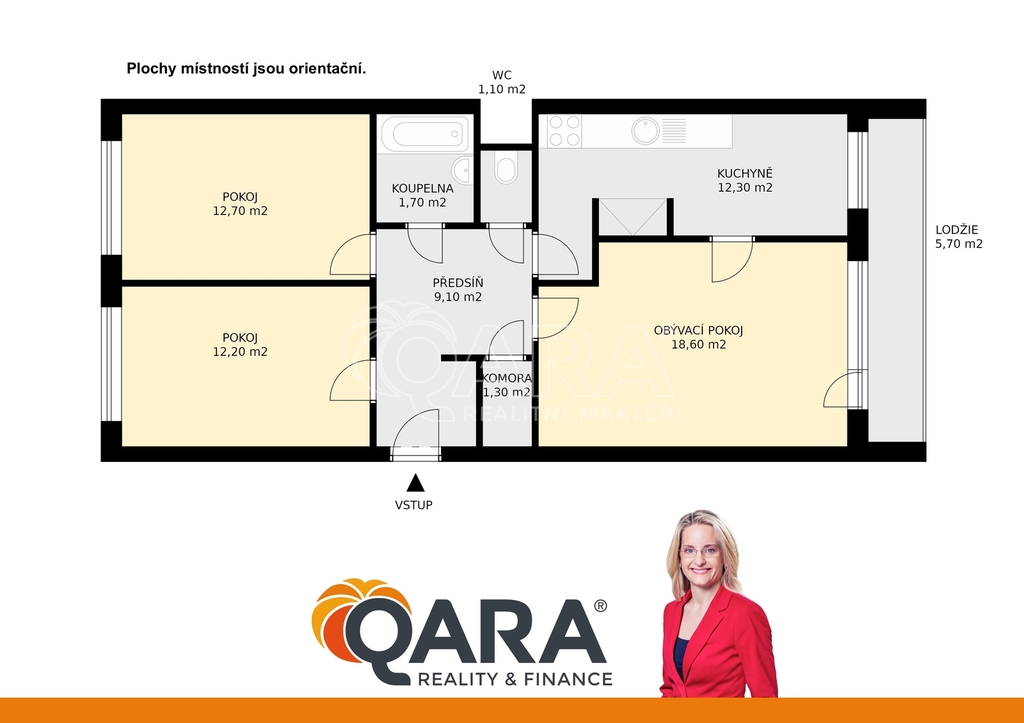 Celková plocha nemovitosti je 79,2 m², z toho vytápěná plocha 69,8 m², plus lodžie o ploše 5,7 m². K bytu také náleží sklep o velikosti 3,7 m².