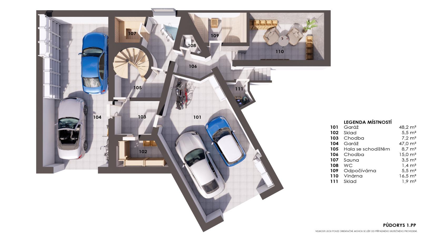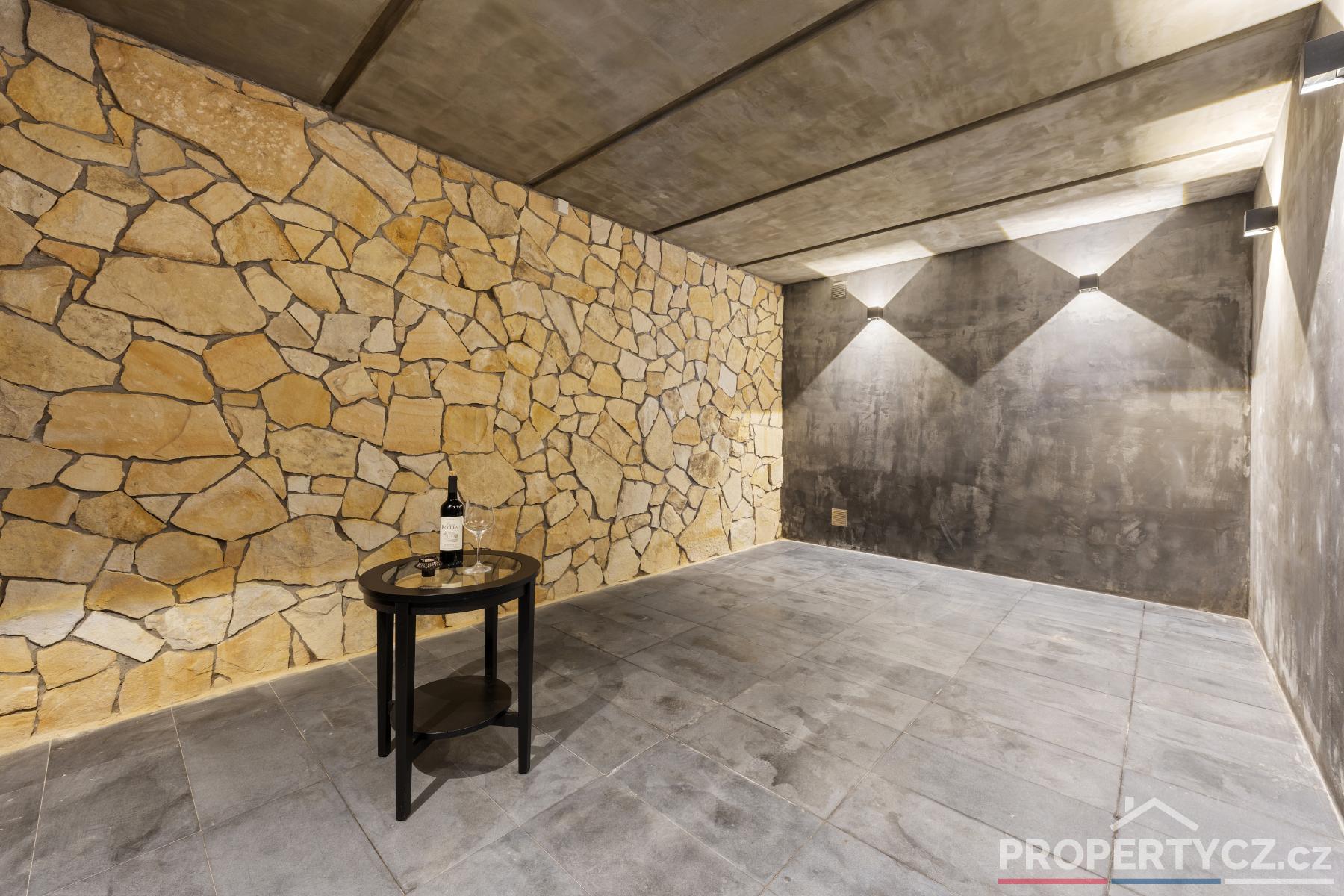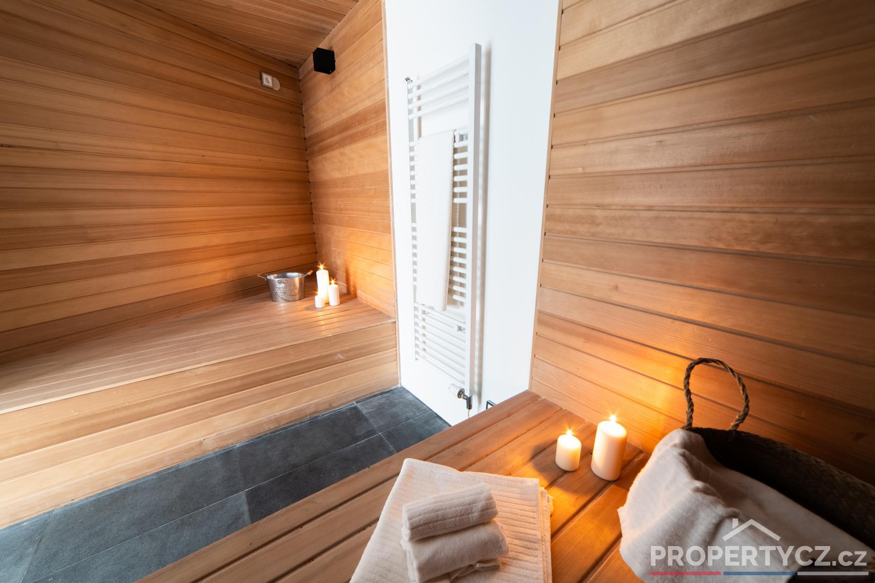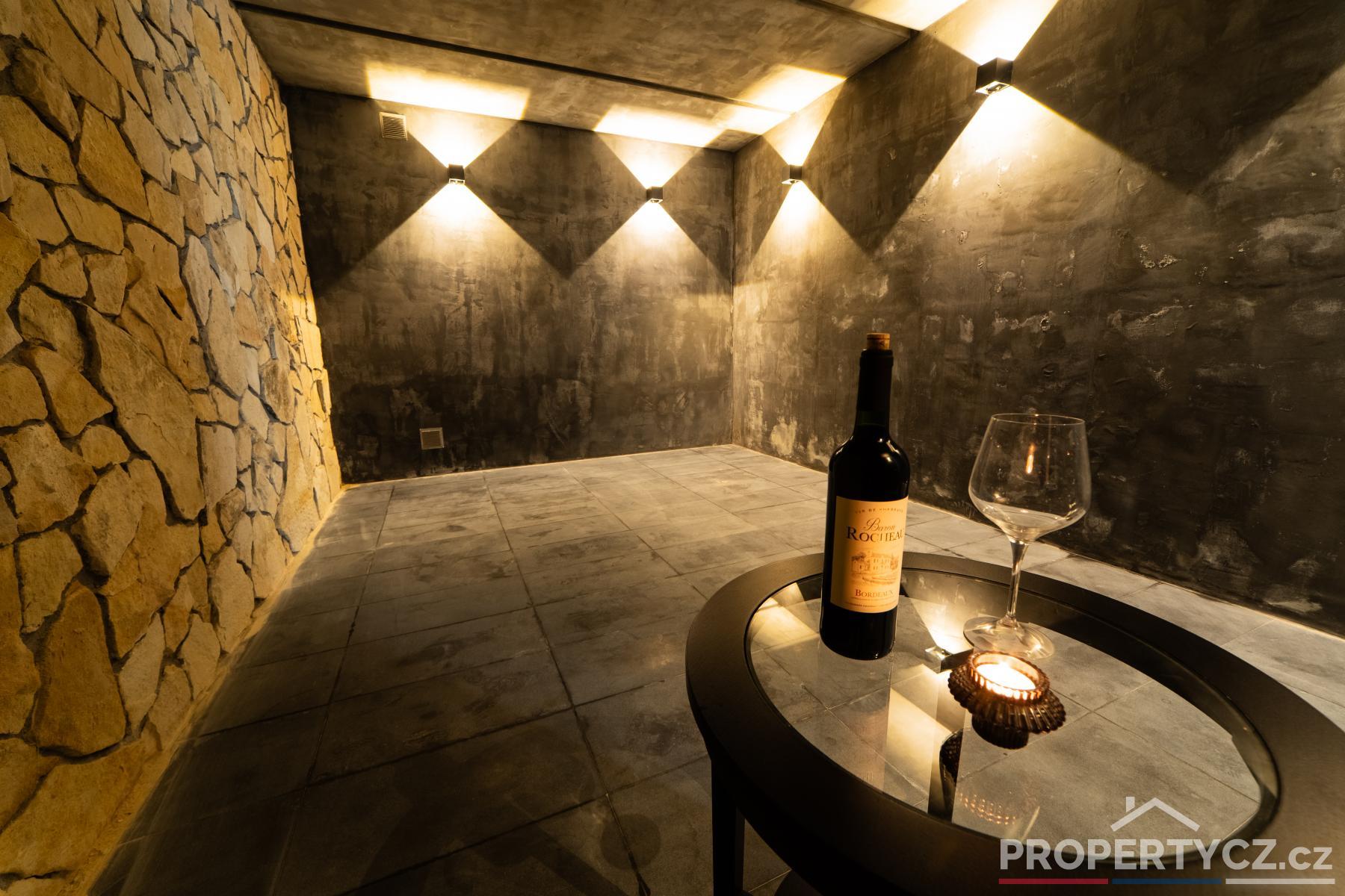 V dalších prostorách přízemí domu naleznete saunu s ochlazovacím jezírkem a sprchou, toaletu, relaxační místnost, vinný sklípek, sklad pro uchovávání věcí a potravin a menší technická místnost na nářadí. Ze zázemí tohoto přízemí můžete rovnou vstoupit na zahradu.
