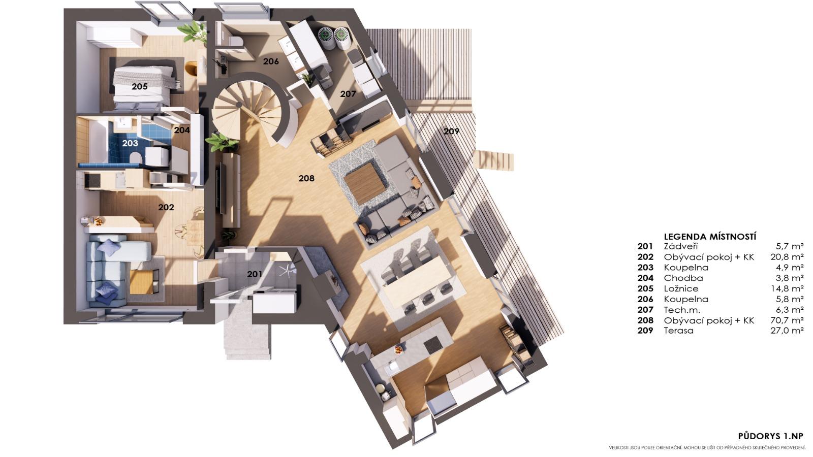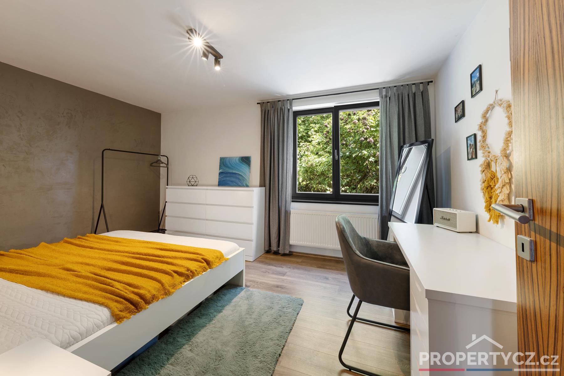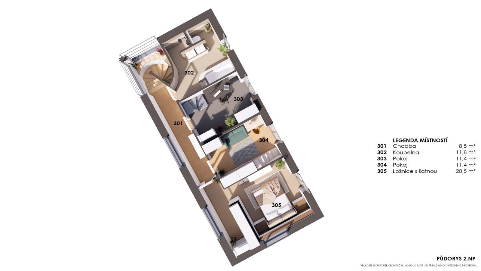Druhé patro tvoří obytná část a nacházejí se zde 3 pokoje, hlavní ložnice se šatnou, další 2 studentské či dětské pokoje s chytře řešeným patrem pro rozšíření prostoru, samostatná koupelna s vanou, sprchou a WC.