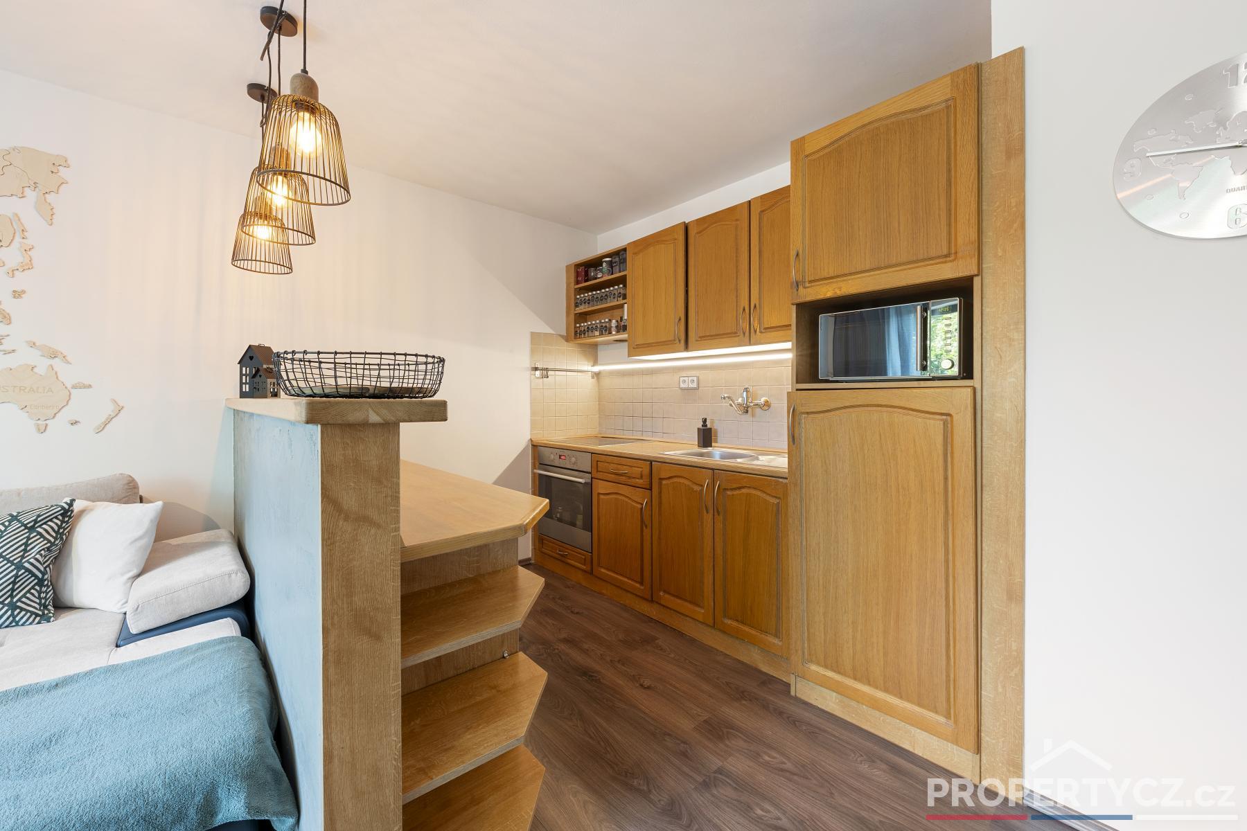 Poutavým prvkem domu jsou hlavní vstupní dveře, kterými se přes zádveří dostanete buď do samostatné bytové jednotky o dispozici 2kk, kde naleznete obývák s kuchyní, koupelnu s vanou a samostatnou ložnici, nebo vás další příjemně poutavé dveře zavedou přímo do centra domu.