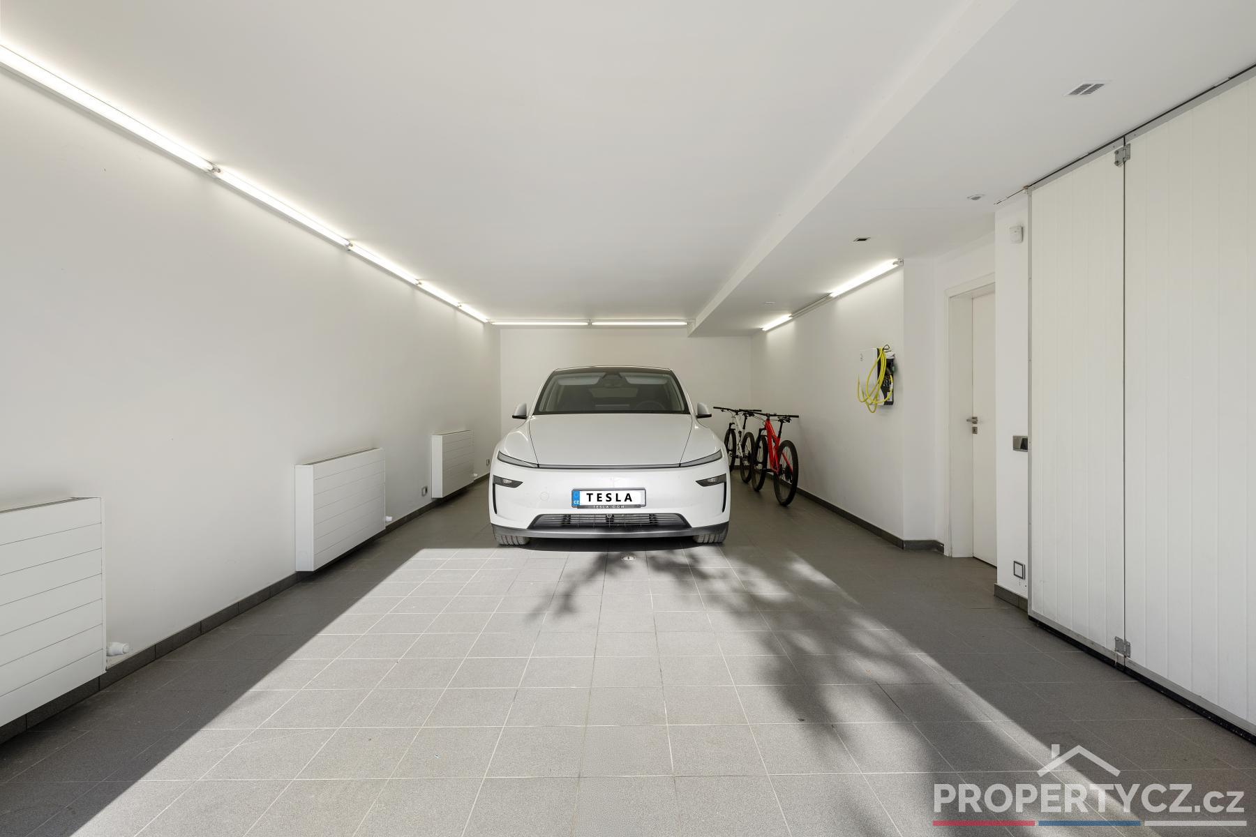 Domov je přístupný 2 samostatnými vjezdy s branou na dálkové ovládání, každý pak vede do samostatné dvou garáže. V levé se nachází dobíjecí elektrostanice, v pravé profi zvedák pro servis vozidel. Suchou nohou se dostanete z obou garáží kamkoliv v domě potřebujete, je totiž prakticky propojen centrálním vnitřním schodištěm, jež spojuje přízemí, první i druhé patro.