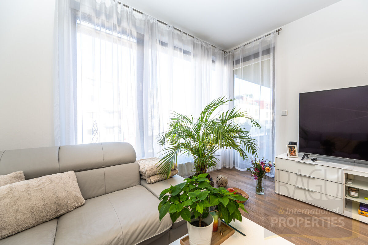 Terasa je přístupná také z obou ložnic a nabízí venkovní prostor s dostatkem místa na posezení, rostliny nebo grilování. Velkoformátová okna v celém bytě zajištují dostatek světla a byt je tak příjemně prosluněný.