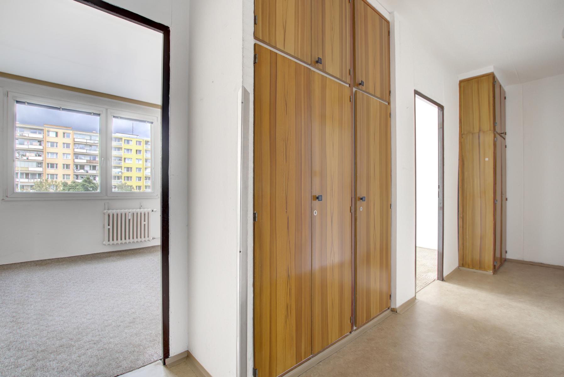 Dispozice: obývací pokoj s lodžií (6 m2), kuchyně, 2 neprůchozí pokoje, zděná koupelna se sprchou, samostatná toaleta, vstupní předsíň, komora, 2. komora před bytem. Byt je částečně zařízený, včetně vestavěných skříní v chodbě, lednice, mikrovlnné trouby, pračky atd. Obývací pokoj a ložnice jsou nezařízené. V bytě jsou bezpečnostní dveře, žaluzie, na podlahách koberec, Vodafone/UPC připojení (TV/Internet).