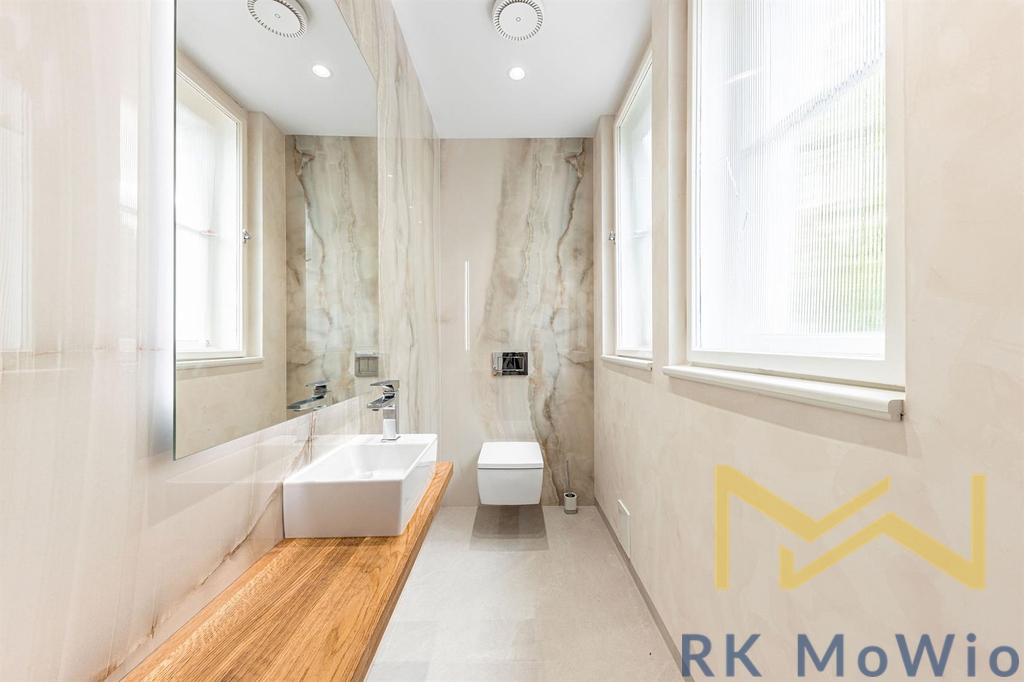 Přízemí této luxusní nemovitosti tvoří vstupní předsíň, přijímací hala s původním schodištěm a průchozí šatna, prostorný obývací pokoj, jídelna a oddělená kuchyně, pracovna, zimní zahrada a samostatná toaleta. Terasa je přístupná z jak jídelny, tak z haly a obývacího pokoje. V prvním patře naleznete hlavní ložnici s privátní koupelnou, vybavenou vanou, sprchou, dvěma umyvadly a toaletou, druhou ložnici se vstupem na balkón, další dvě ložnice, oddělenou koupelnu se sprchovým koutem, dvěma umyvadly, bidetem a toaletou se vstupem na balkón. Druhé patro disponuje chodbou, hlavní ložnicí se soukromou koupelnou, dalšími třemi ložnicemi, samostatnou koupelnou a praktickou šatnou. V suterén domu se nachází vinný sklípek, prádelna, úložné prostory a technické zázemí (kotelna, sklad). Vybavení domu zahrnuje kuchyňskou linku se spotřebiči značky Miele (včetně lednice s mrazákem, sklokeramické varné desky, digestoře, zabudované elektrické a mikrovlnné trouby), vestavěné skříně z dřevěného masivu, štuky a úložné prostory, sanita Villeroy & Boch a Hansgrohe, plynový kotel, přípojka pro pračku a sušičku, francouzská okna, alarm, zrenovované původní dřevěné plochy a podlahy, italská velkoformátová dlažba a obklady. Vila má inteligentní systém řízení domácnosti Loxone Smart Home (ovládání přes chytrý telefon), podlahové vytápění v kuchyni a koupelnách, WiFi 6, kamerový systém, shoz prádla. Na pozemku je možnost parkovacího stání a dobíjení elektromobilu.