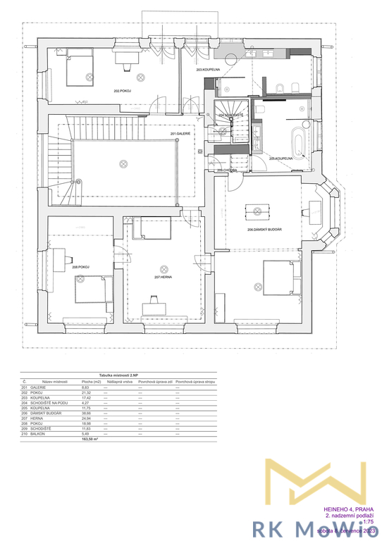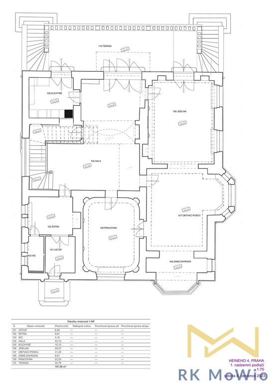 Značnou výhodou je terasa o rozloze 32,79 m2, zimní zahrada (9,61 m2), balkón o výměře 5,49 m2 a zahrada, v ulici Heineho v reprezentativní lokalitě diplomatické čtvrti Prahy 6 - Bubeneč, v blízkosti zahraničních ambasád.