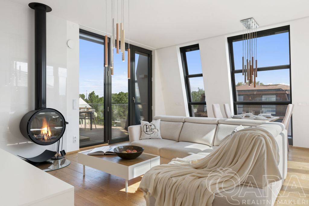 Atmosféru domova dotváří krb v obývací části, zatímco dvě jižně orientované terasy poskytují nerušené soukromí a krásné výhledy do pečlivě udržovaného areálu, který je přístupný pouze obyvatelům rezidence.
