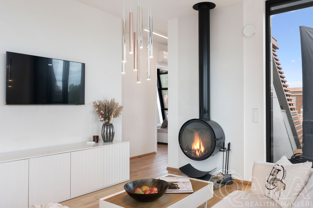 Atmosféru domova dotváří krb v obývací části, zatímco dvě jižně orientované terasy poskytují nerušené soukromí a krásné výhledy do pečlivě udržovaného areálu, který je přístupný pouze obyvatelům rezidence.