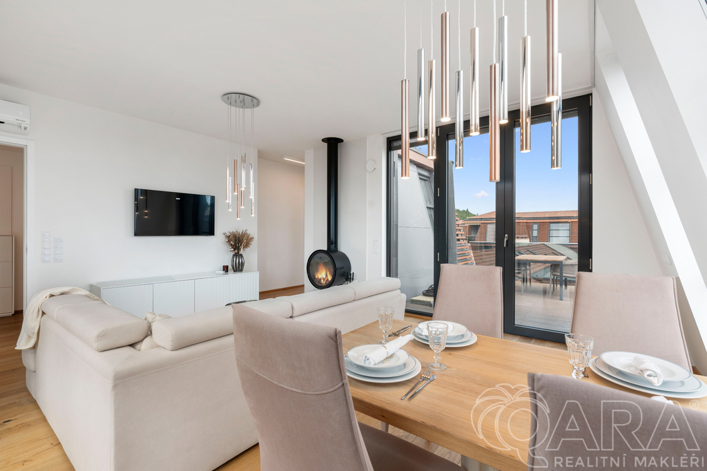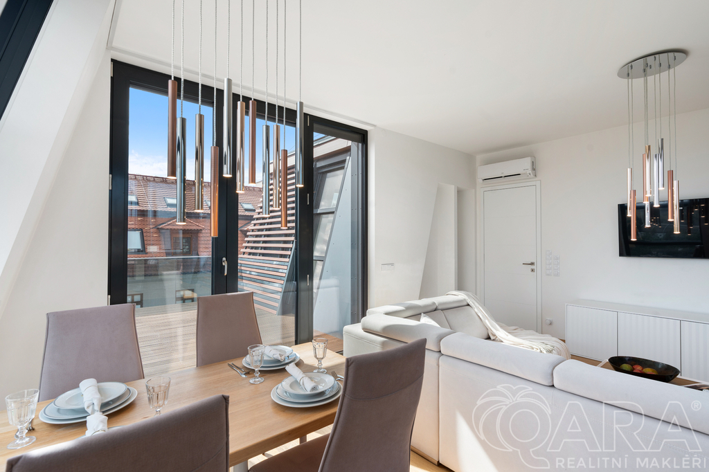 Měsíční nájemné zahrnuje pronájem plně vybavený penthouse nábytkem a spotřebiči, 1 garážového stání a sklepa: 59 000 Kč,