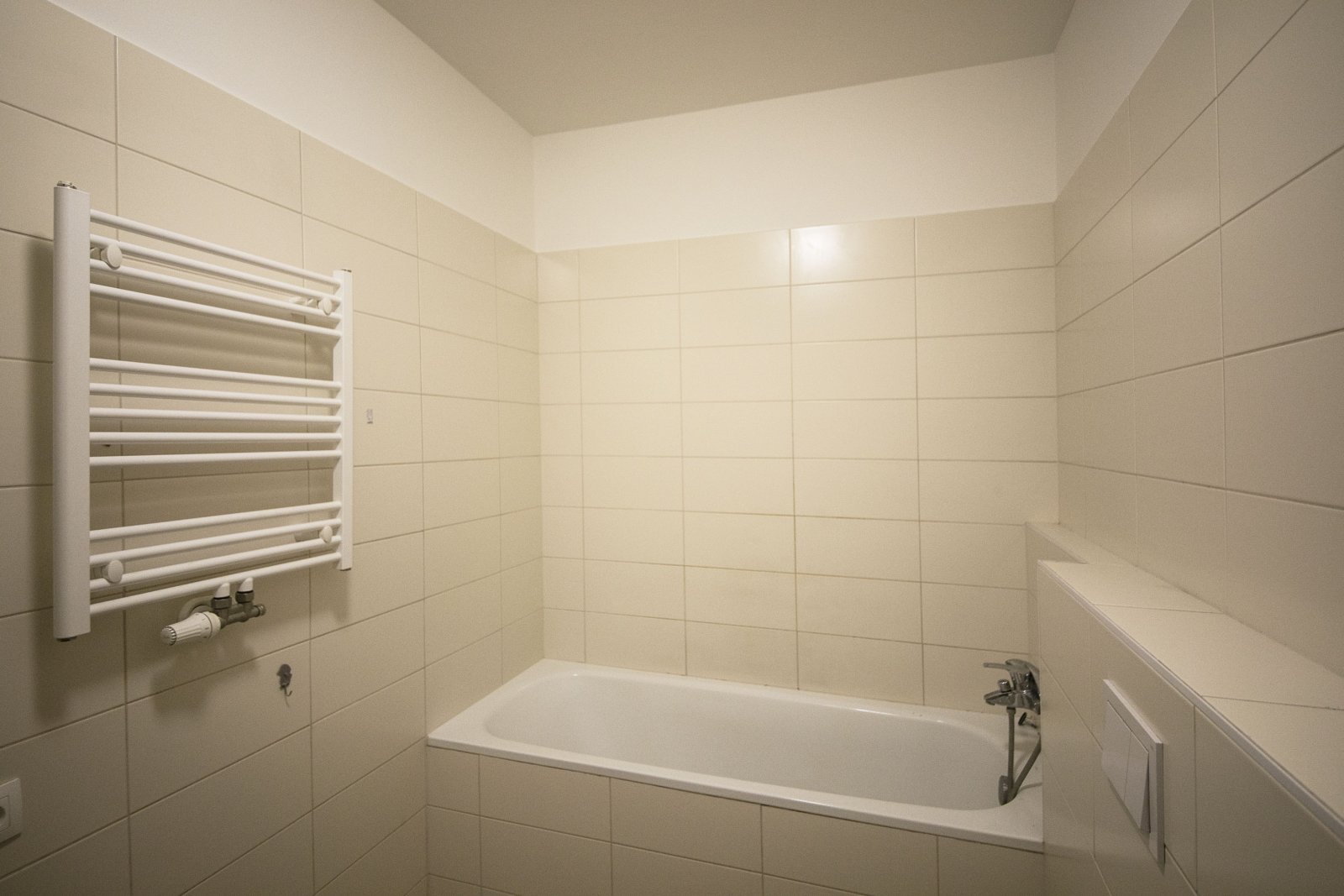 Nová kuchyňská linka s vestavěnými spotřebiči (sklokeramická deska, el. trouba, myčka na nádobí, dále volně stojící lednice s mrazákem). V koupelně vana a WC, příprava na pračku a sušičku.