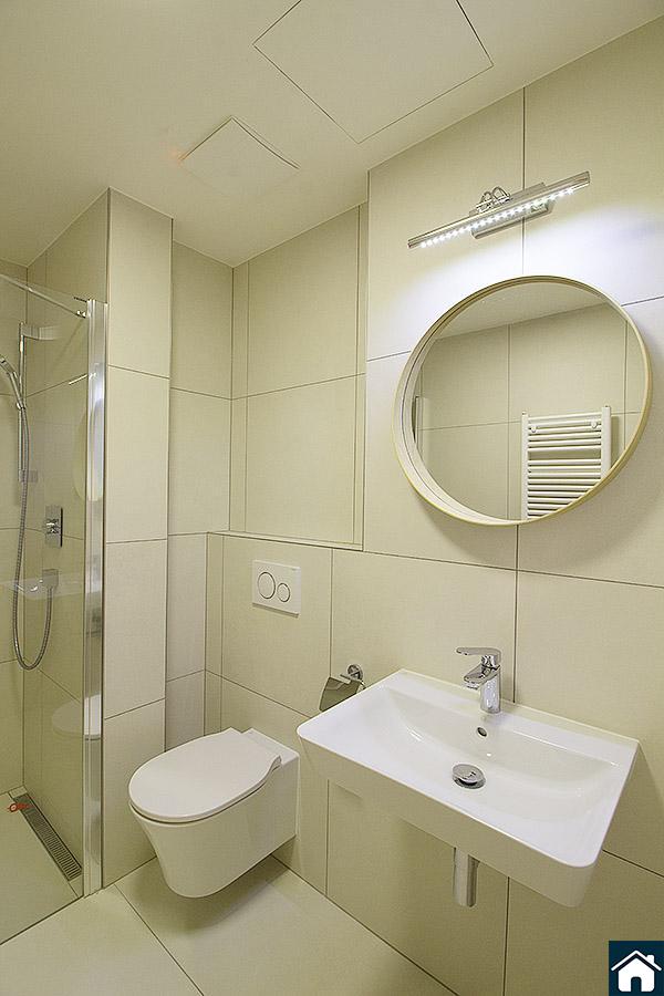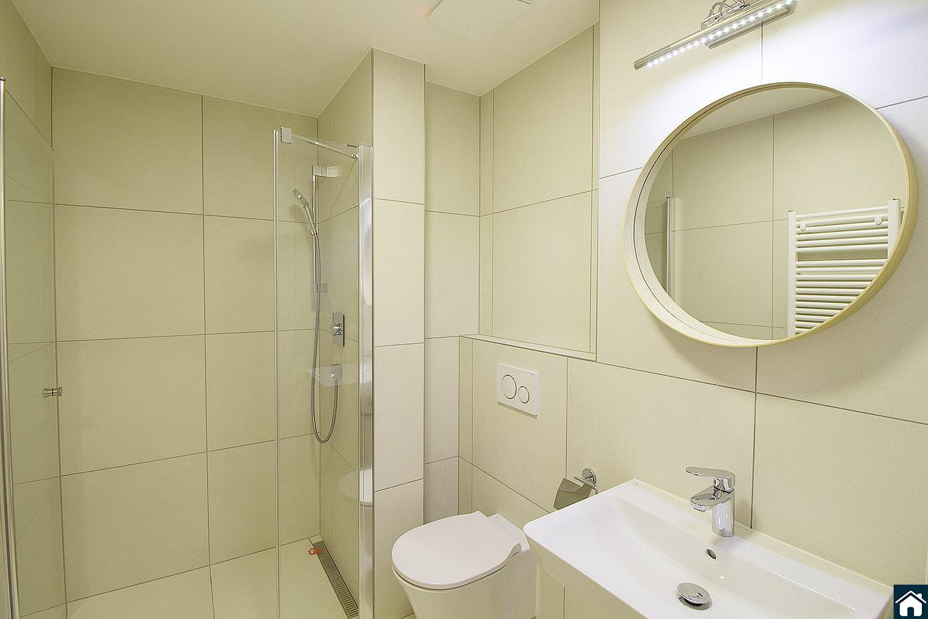 Koupelna je vybavena prostorným sprchovým koutem a s WC je společně.