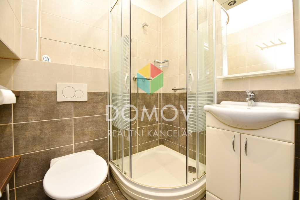 Koupelna je vybavená sprchovým koutem, umyvadlem a WC.