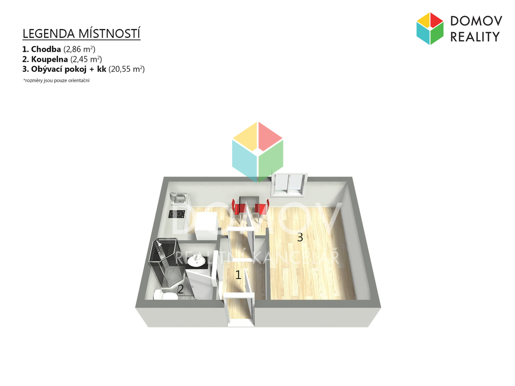 Byt má výměru 25,3 m2 + sklepní kóje o velikosti 3 m².