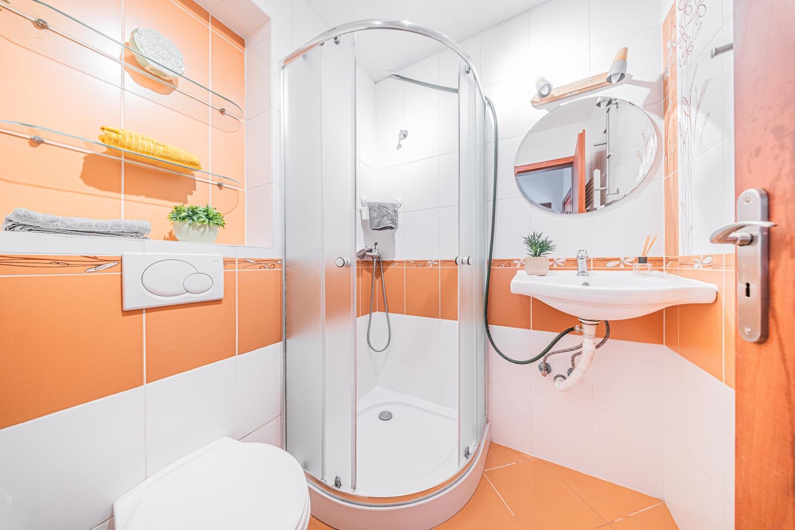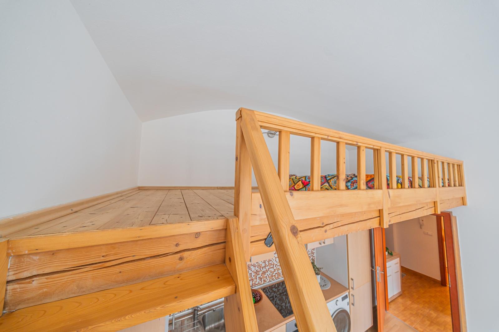 Praktická dispozice 2+kk využívá efektivně každý metr čtvereční, který zde máte k dispozici. Z předsíně je vstup do koupelny se sprchovým koutem a WC, do ložnice a také do hlavní obytné místnosti, obývacího pokoje s kuchyňským koutem. Vysoké stropy zajišťují jak příjemnou vzdušnou atmosféru, tak přináší i dostatek místa. Tento potenciál je plně využit nad kuchyňským koutem, kde najdete praktické dřevěné patro. Můžete jej využít jako další místo ke spaní či jako nadstandardní úložný prostor.