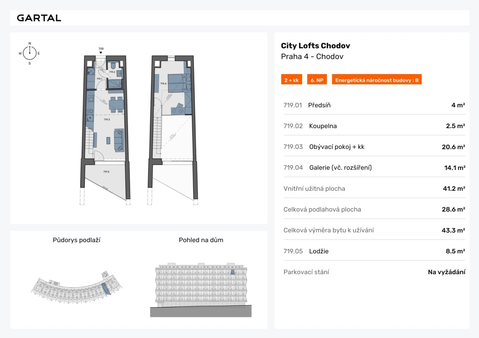 Nabízíme k prodeji loftový byt (719) o dispozici 2+kk (43,3 m2) v projektu City Lofts Chodov, který se skládá z obývacího pokoje (20,6 m2), galerie (14 m2), koupelny s WC (2,5 m2), předsíně (4 m2) a lodžie (8,7 m2).