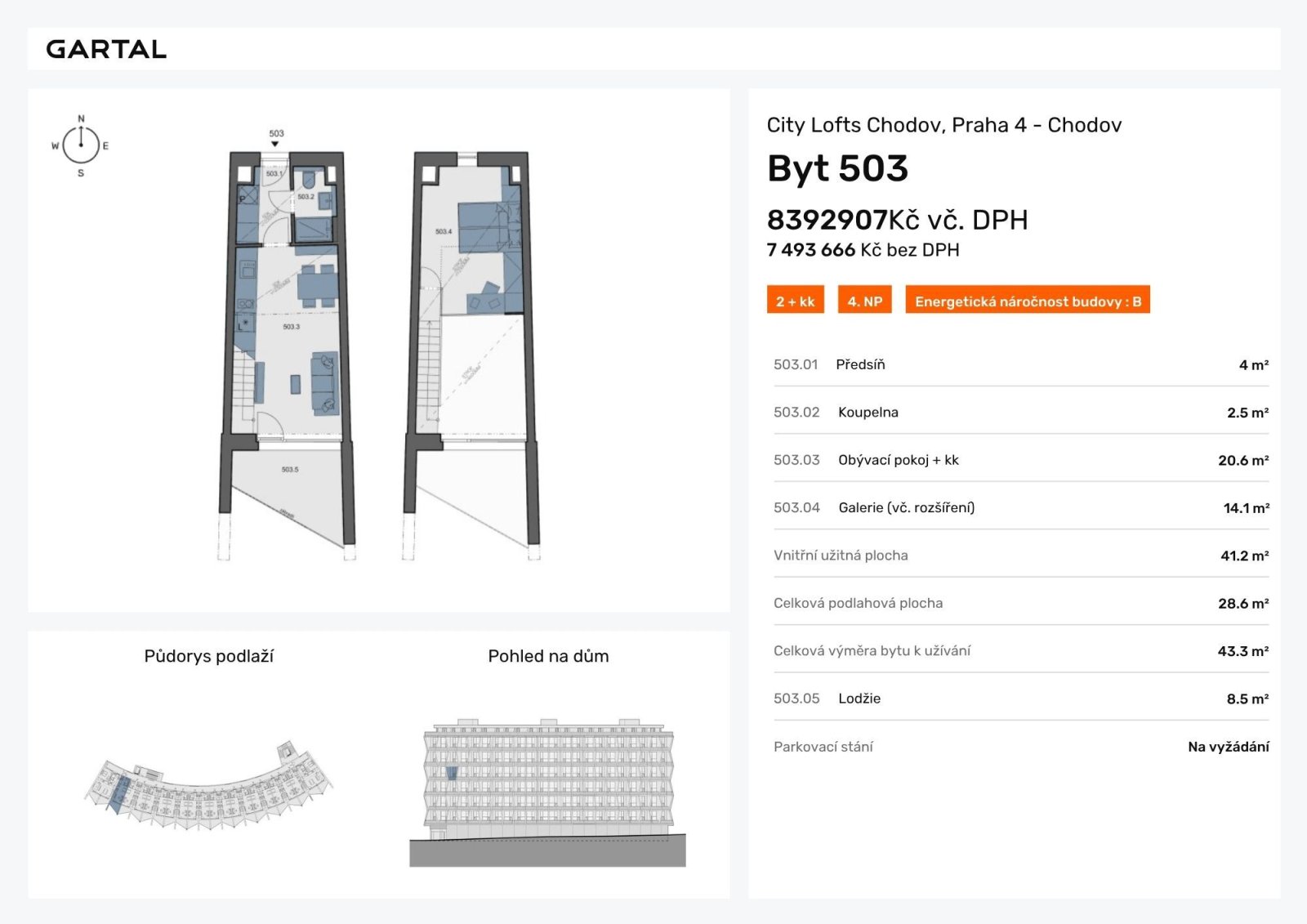 Nabízíme k prodeji loftový byt (503) o dispozici 2+kk (43,3 m2) v projektu City Lofts Chodov, který se skládá z obývacího pokoje (20,6 m2), galerie (14 m2), koupelny s WC (2,5 m2), předsíně (4 m2) a lodžie (8,7 m2).