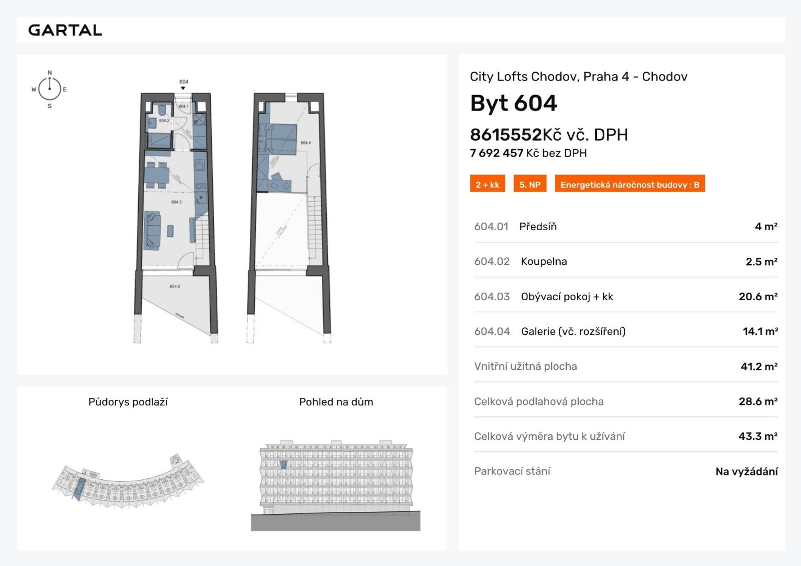 Nabízíme k prodeji loftový byt (604) o dispozici 2+kk (43,3 m2) v projektu City Lofts Chodov, který se skládá z obývacího pokoje (20,6 m2), galerie (14 m2), koupelny s WC (2,5 m2), předsíně (4 m2) a lodžie (8,7 m2).