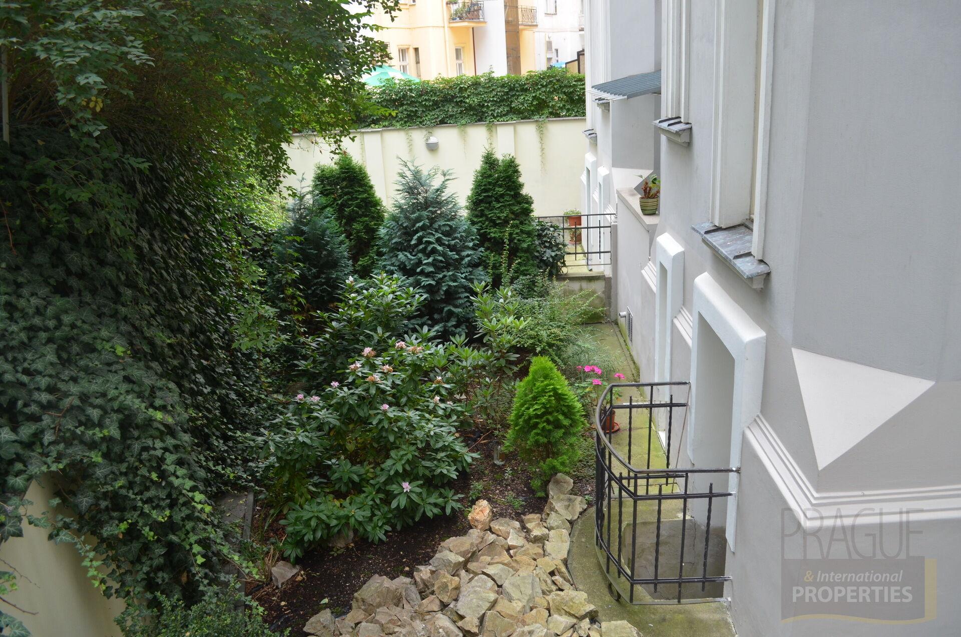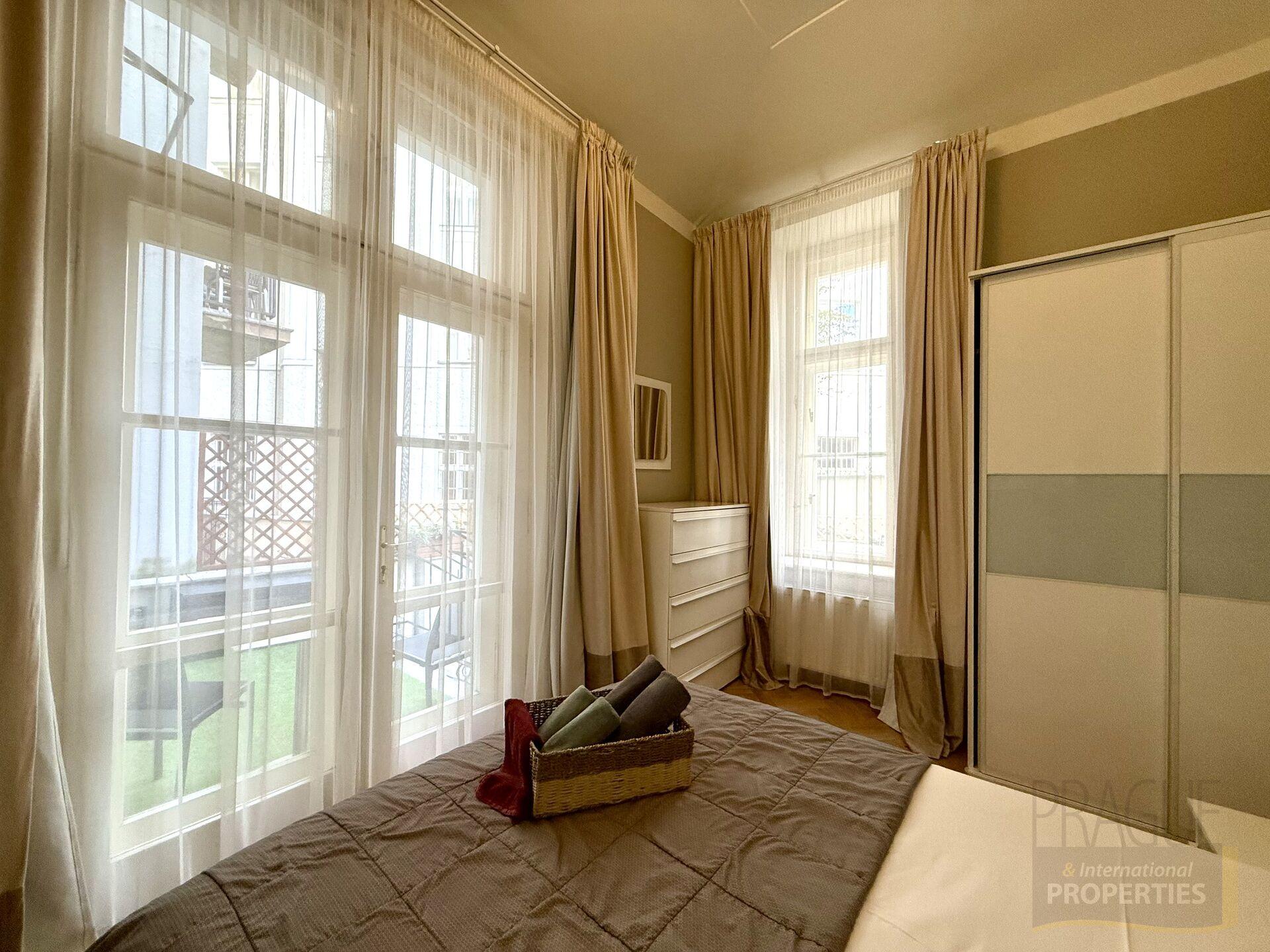Exkluzivní secesní apartmán 2+1 o rozloze 54 m² v srdci Starého Města — Maiselova, Praha 1. Velmi vkusně zařízený byt ve zvýšeném přízemí reprezentativní budovy s recepcí je orientován do zeleného vnitrobloku. Nabízí vstupní halu, samostatnou plně vybavenou kuchyni, útulnou ložnici a koupelnu s vanou. Světlý obývací pokoj s pohodlnou rozkládací sedací soupravou, křeslem, TV stěnou a elegantní jídelní zónou plynule navazuje na soukromou terasu s posezením a zeleným dvorkem — část dvora o výměře 45,82 m² je výlučně užívána vlastníkem jednotky. Byt se pyšní francouzskými okny jak v ložnici, tak v obývacím pokoji, která vnášejí do interiéru světlo a přímé propojení s terasou. Komfortní kombinace městského života a klidného zeleného zázemí uprostřed historického centra. Všechny služby, exkluzivní butiky, kavárny a restaurace v dosahu, OC Palladium i Kotva cca 10 min pěšky, metro Staroměstská pouhé 3 minuty. Ideální jako prestižní bydlení i výnosná investice pro krátkodobé pronájmy. Luxusní adresa, která okouzlí.