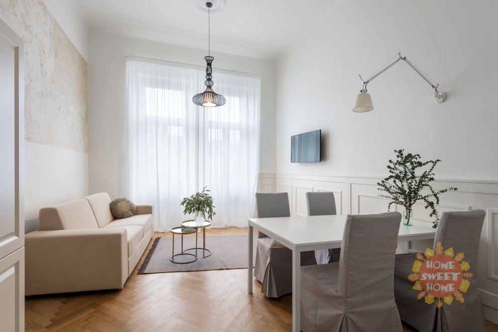 Byt má vysoké stropy a velkou obývací část s vybavenou, na míru vyráběnou kuchyní a dalšími truhlářskými prvky na míru. V předsíni je velká šatna ( walk-in ) a úklidové zázemí s pračkou se sušičkou. Byt se nachází 50 m od stanice tram U Zvonu a 5 min od stanice metra Anděl. Parkování je možné v garážích v domě. Apartmán je věnován památce našeho prvního porevolučního pana prezidenta – Václava Havla. Apartmán je vybaven klimatizací. 1x týdně průběžný úklid s výměnou povlečení a ručníků, prádelna pro hosty, připojení TV/WIFI/ SAT, služba recepce. Možnost krátkodobého pronájmu.