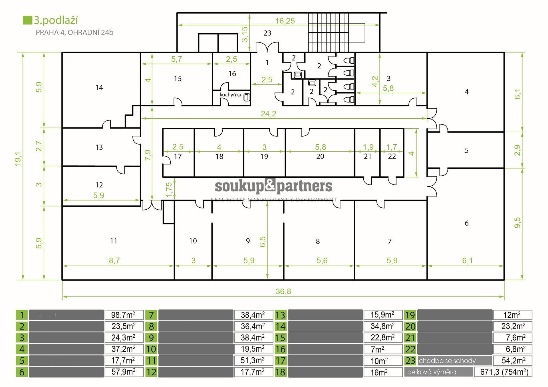 Kancelář 36,4 m2, která se nachází ve 3. podlaží administrativní budovy v Praze 4 - Michle. Jedná se o samostatnou kancelář s centrálním vytápěním. Otevíratelná plastová okna, na podlaze nový koberec, datové rozvody. Možnost registrace sídla společnosti a pronájmu parkovacího stání. Pro nájemce je přístup do budovy 24/7, na patře společná kuchyňka a toalety. Kancelář v půdorysu označena č. 8. Budova po rekonstrukci - 2x nový výtah, zateplená fasáda, platová okna, napojení na centrální pult ochrany, úpravy společných prostor. Výborná dopravní dostupnost - 10 min. MHD Metro C, zastávka Kačerov. Volné dle dohody. Pro více informací volejte manažera nabídky.