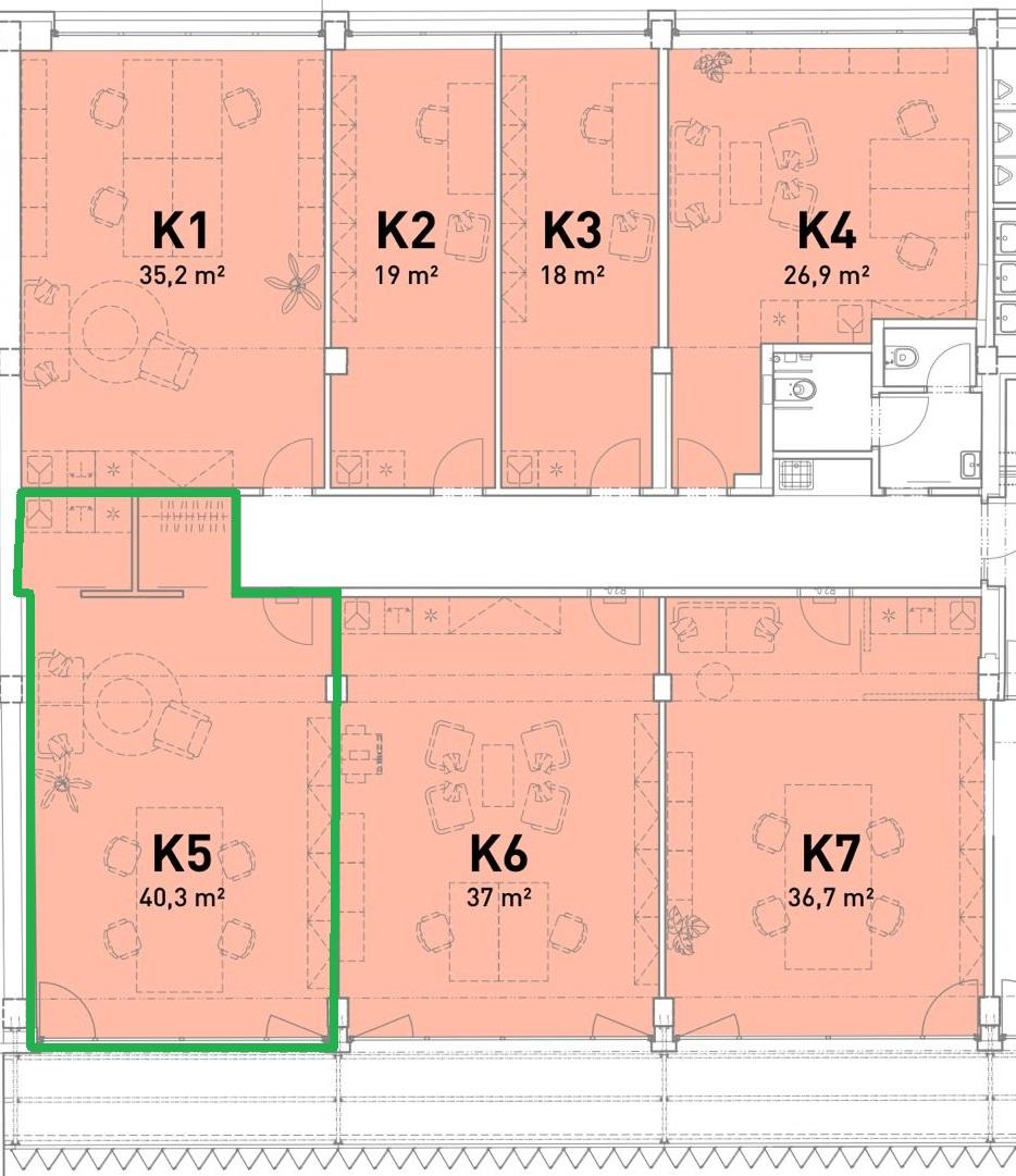 Kancelář je klimatizovaná a orientovaná na jihovýchod, což zajišťuje dostatečný přísun světla po celý rok. Celá jižní stěna je navíc prosklená, a zvenku lemovaná balkonem, který je přístupný a je součástí kanceláře. K dispozici je kuchyňka a sklad.