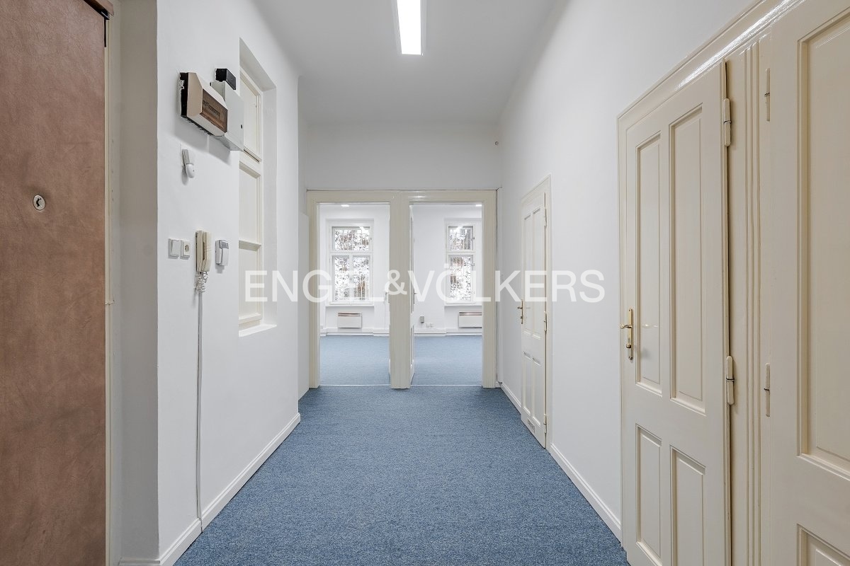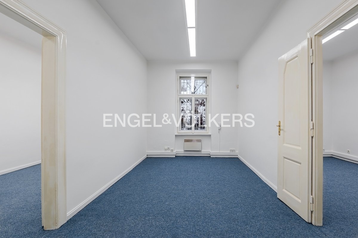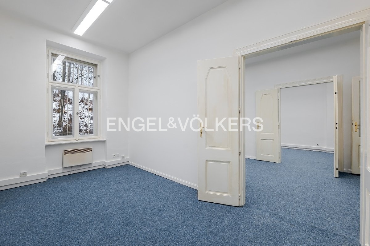 Prostorné, nezařízené kanceláře sestávající ze čtyř místností, chodby a toalety o podlahové ploše 89 m² se nacházejí v přízemí cihlového domu v atraktivní oblasti Prahy 5 – Smíchov. V kanceláři je nový zátěžový koberec. Tato budova byla postavena na počátku 20. století v secesním stylu a nedávno prošla citlivou rekonstrukcí. V současnosti je využívána jako polyfunkční objekt pro administrativní účely a bydlení. Objekt se nachází v širším centru Prahy, nedaleko nově budované lokality Nový Smíchov na úpatí rezidenční čtvrti Malvazinky. Je dobře dostupný jak MHD, tak autem z centra i z městských okruhů. V bezprostředním okolí objektu se nacházejí dva městské parky, škola, restaurace, obytné i administrativní objekty, obchody, služby i banky. Stanice metra B Anděl je asi 5 minut chůze od domu.