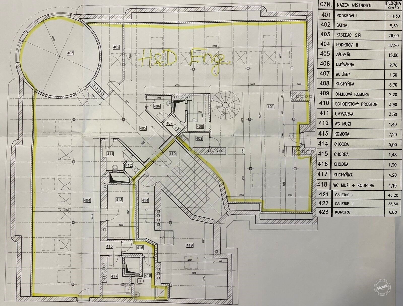 Související prostory velká zasedací místnost, sklady, serverovna, kuchyňky, toalety, vstupní zádveří. viz fotodokumentace vč. plánu podlaží.