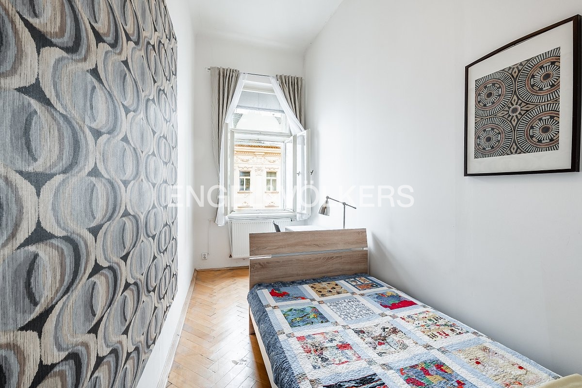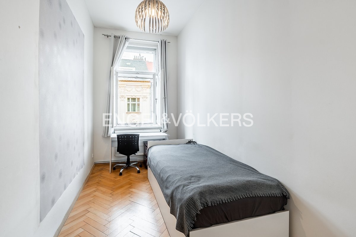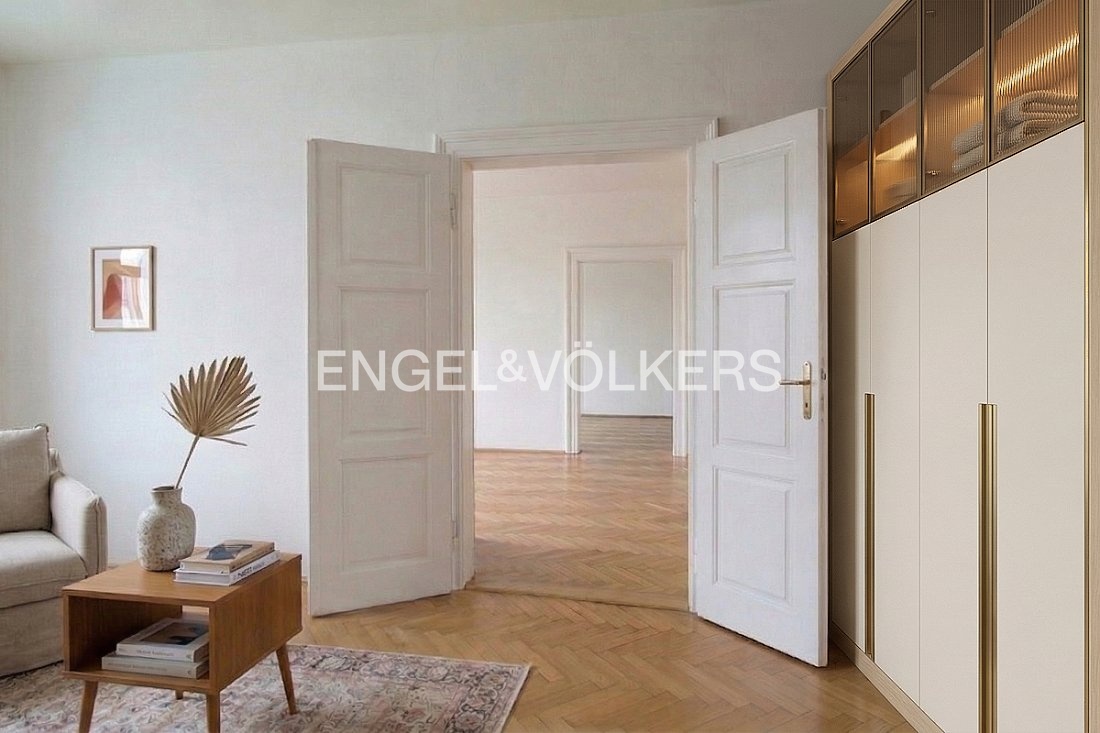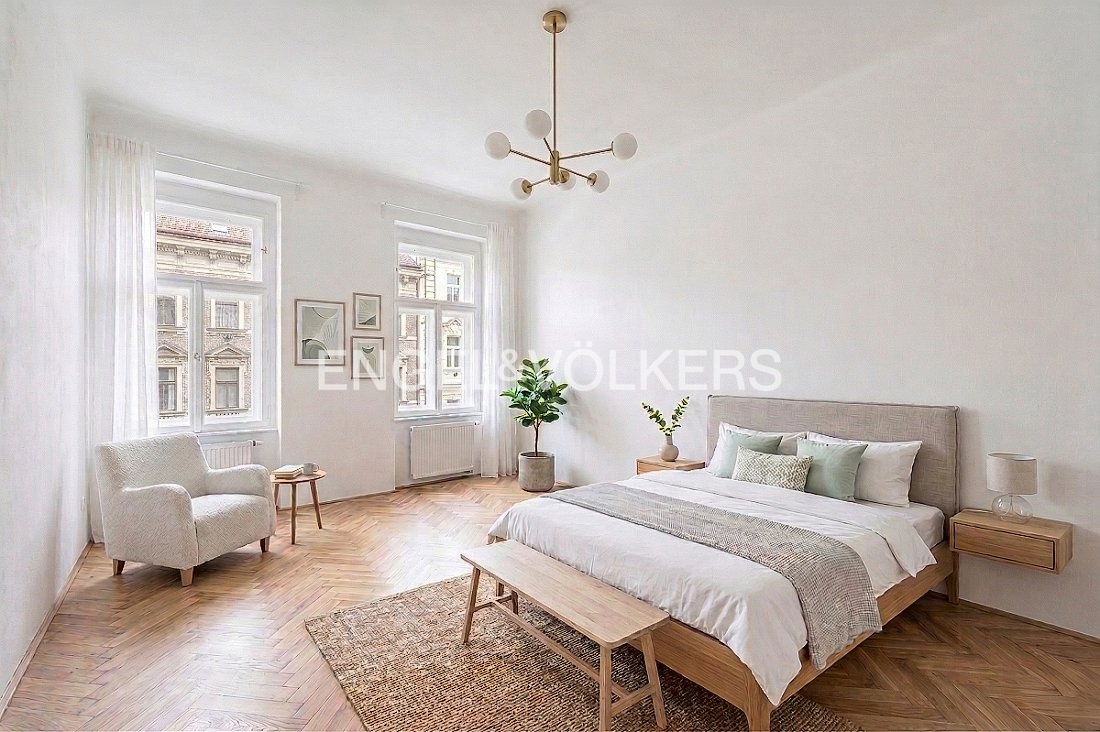 Byt prošel rekonstrukcí v roce 2001 a v roce 2015 byl dispozičně upraven do současného řešení. V původní dispozici 3+1 zaujmou impozantní stropy výšky 3,7 m, zachované původní parkety a interiérové dveře – prvky, které dodávají prostoru nezaměnitelný charakter. Pro účely pronájmu je byt aktuálně uspořádán jako 6+1 se dvěma koupelnami. Aktuální příjem z pronájmu je 95 000 Kč měsíčně.