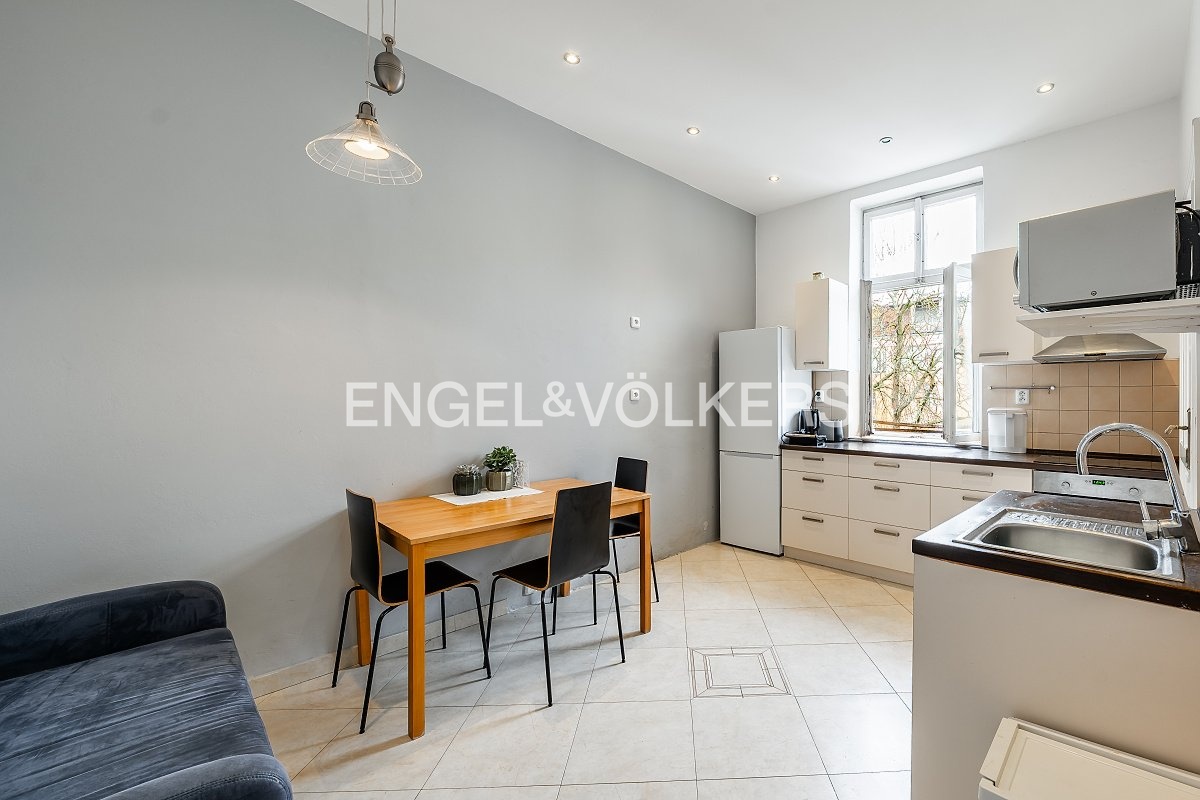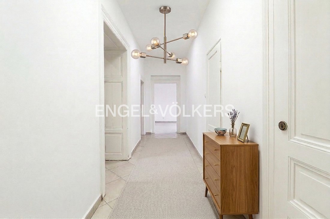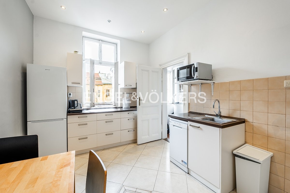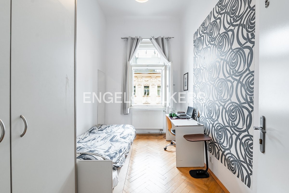 Byt prošel rekonstrukcí v roce 2001 a v roce 2015 byl dispozičně upraven do současného řešení. V původní dispozici 3+1 zaujmou impozantní stropy výšky 3,7 m, zachované původní parkety a interiérové dveře – prvky, které dodávají prostoru nezaměnitelný charakter. Pro účely pronájmu je byt aktuálně uspořádán jako 6+1 se dvěma koupelnami. Aktuální příjem z pronájmu je 95 000 Kč měsíčně.