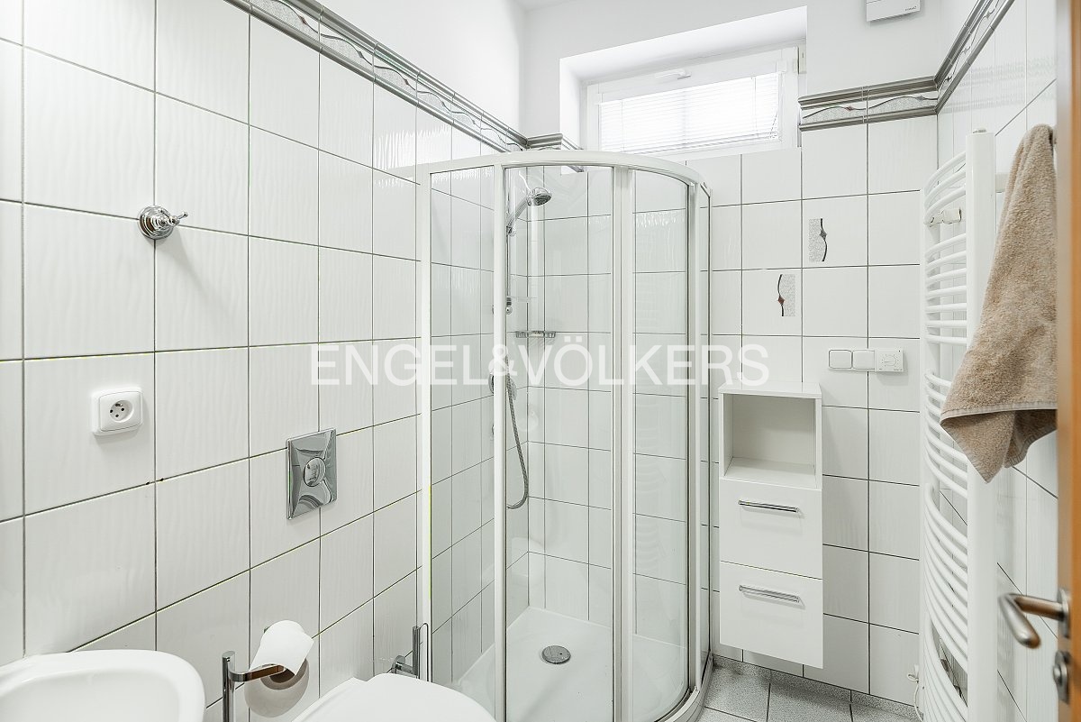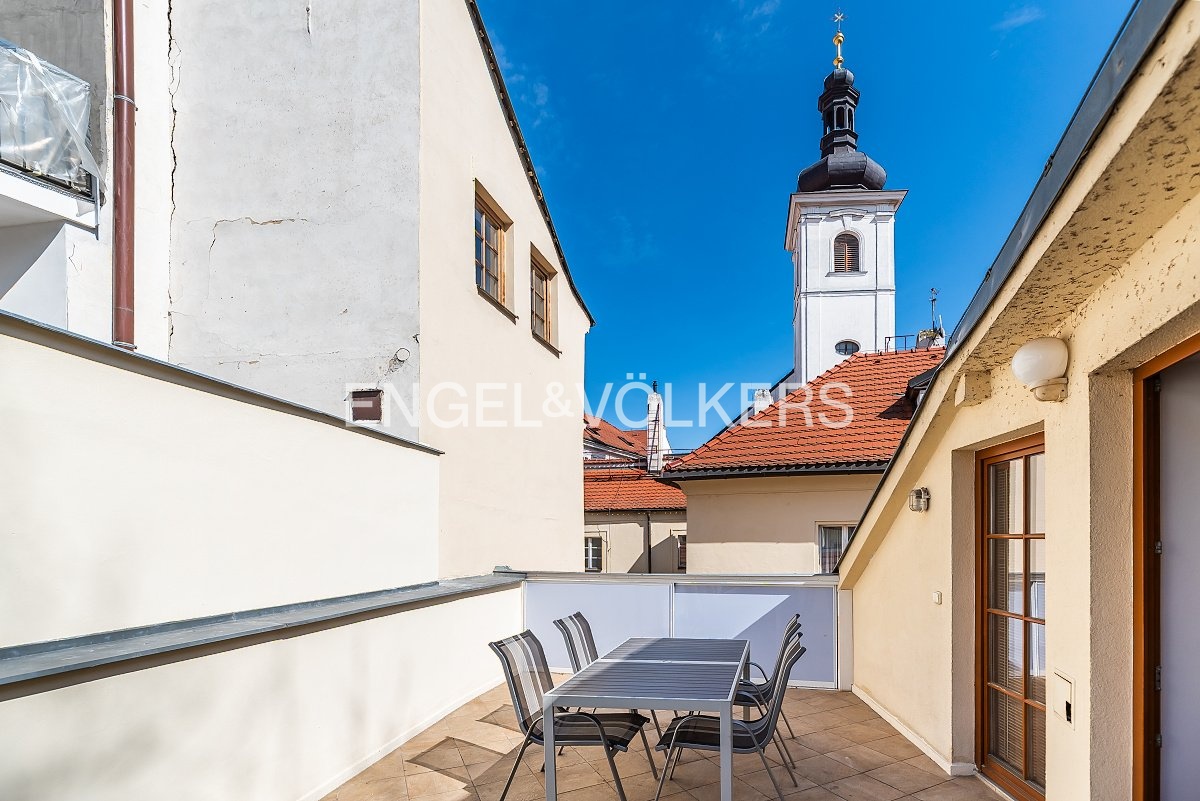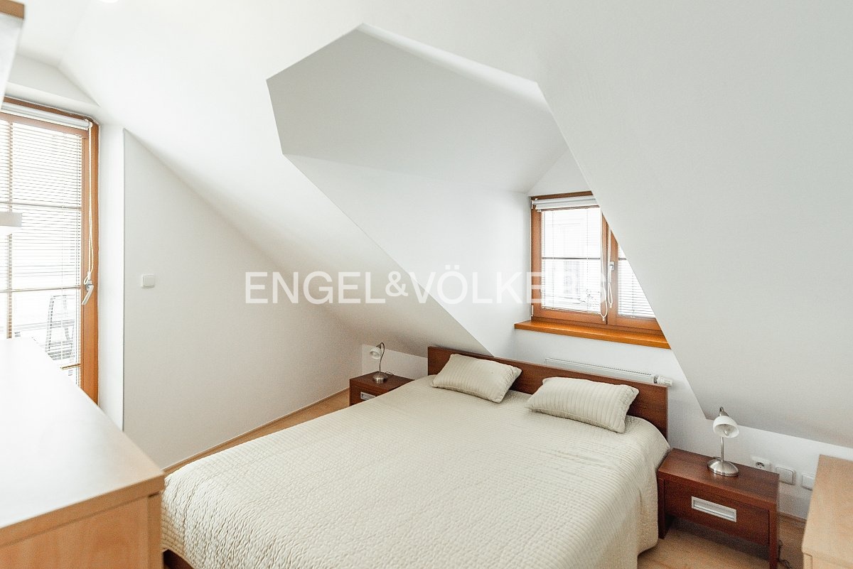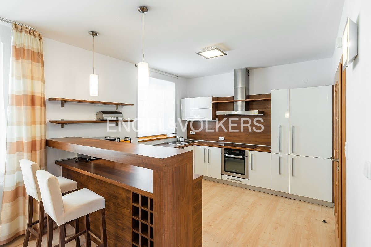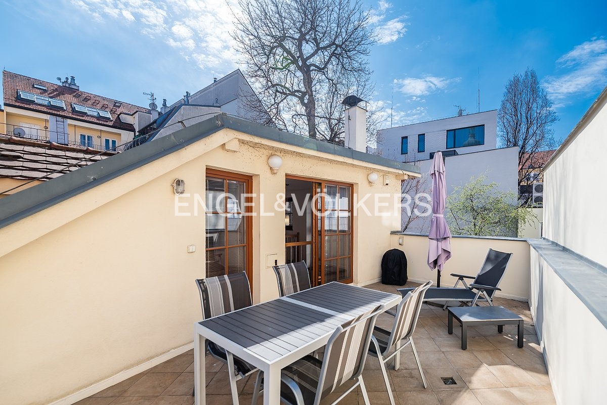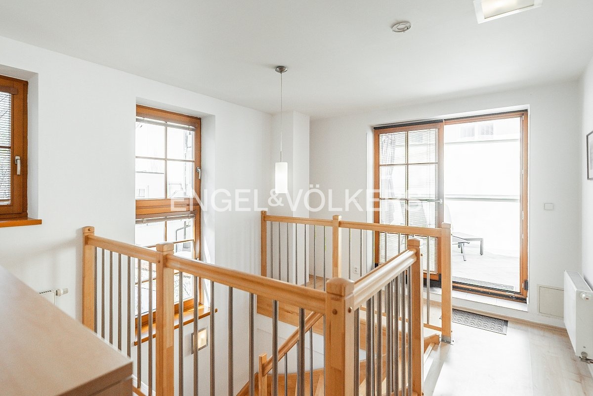 Srdcem apartmánu je prostorný obývací pokoj s krbem a plně zařízeným kuchyňským koutem. Po schodech se dostanete do kompletně vybaveného patra. Najdete zde ložnici, pracovnu, kterou lze předělat na dětský pokoj, dokonce i vlastní velkou koupelnu s vanou. K bytu náleží i terasa s posezením, kde si můžete vychutnat sluníčko a klid, jelikož je také orientovaná do vnitrobloku. Ve spodním podlaží je k dispozici praktická šatna, druhá koupelna i technická místnost.