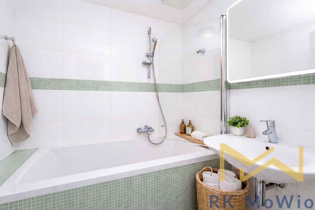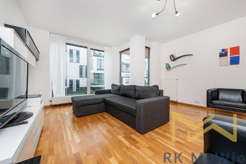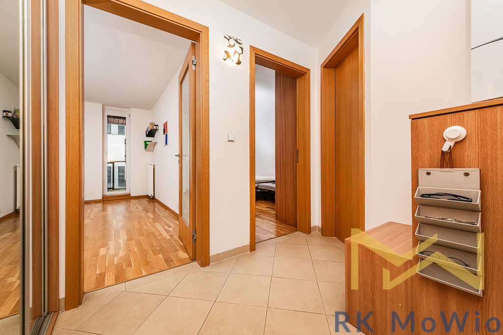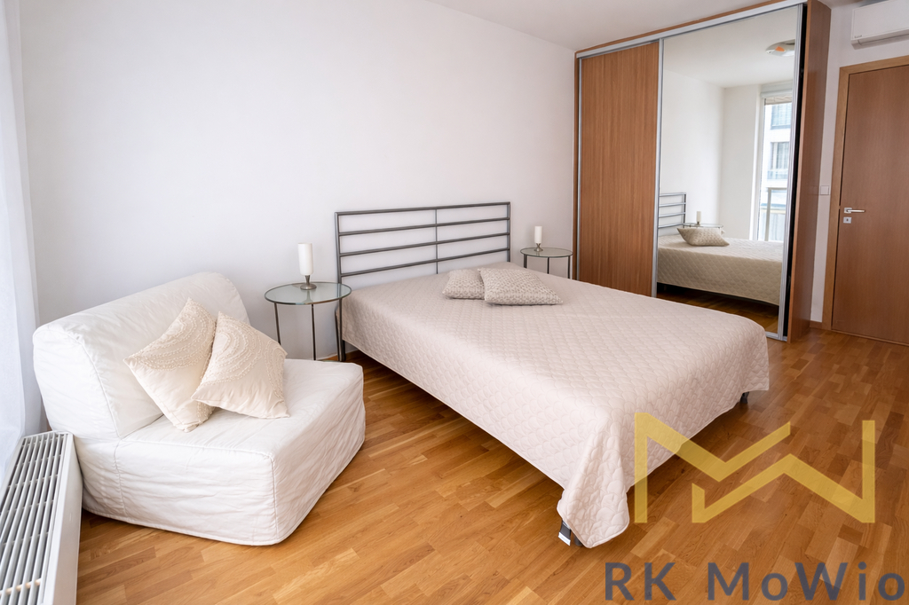 Půdorys bytové jednotky disponuje vstupní chodbou, prostorným obývacím pokojem kuchyňským koutem a jídelním prostorem se vstupem na balkón, ložnicí také se vstupem na balkón, 1 koupelnou (s vanou, umyvadlem) a samostatnou toaletou. Vybavení bytu: kuchyňská linka (včetně lednice s mrazákem, sklokeramické varné desky, digestoře, myčky a elektrické trouby), vestavěné skříně, pračka a sušička. Možnost pronajmout parkovací stání za extra příplatek 2.500,-Kč/ měsíc.