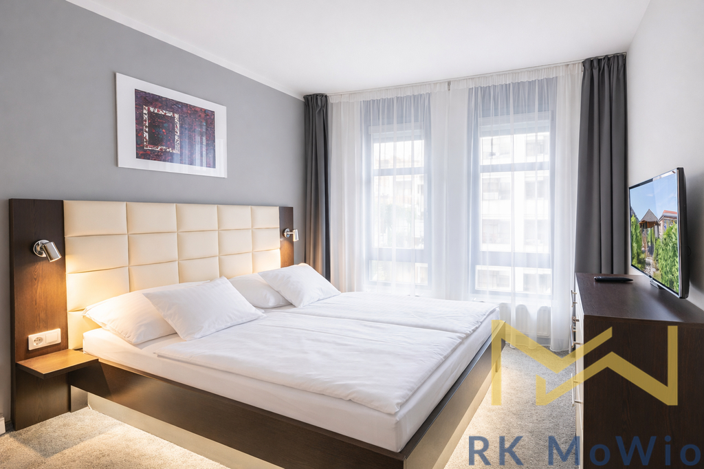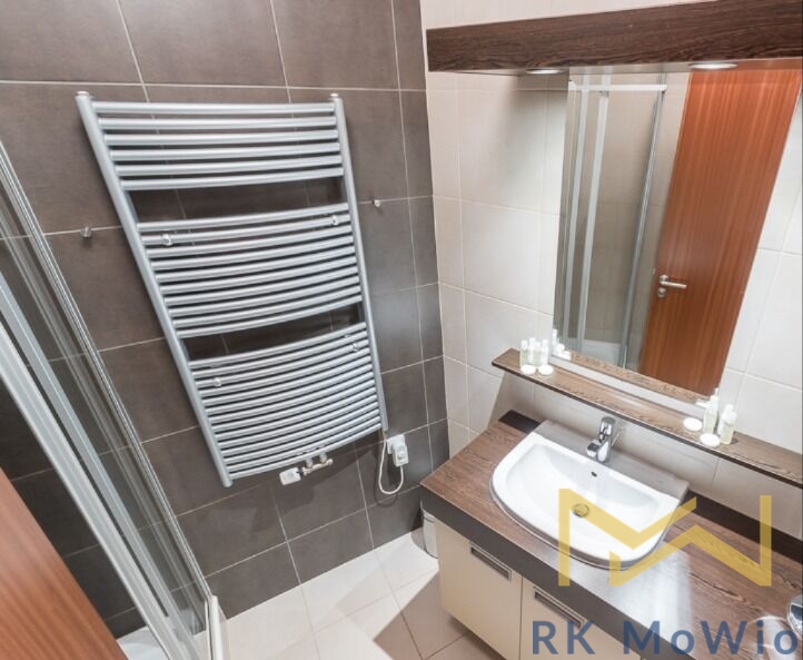 Půdorys bytu disponuje vstupní chodbou, prostorným obývacím pokojem se vstupem na balkón, kuchyňským koutem a jídelní částí, hlavní ložnicí se vstupem na balkón, druhou ložnicí, 1 koupelnou (se sprchou a umyvadlem), oddělenou toaletou (s bidetem) a komorou. Vybavení bytu: kuchyňská linka (včetně lednice s mrazákem, sklokeramické varné desky, digestoře, myčky, elektrické a mikrovlnné trouba), vestavěné skříně, pračka, sušička, příprava pro vysokorychlostní internet, dřevěné podlahy a dlažba. Garážové stání je možné si pronajmout za extra poplatek 2.500,- Kč/měsíc.