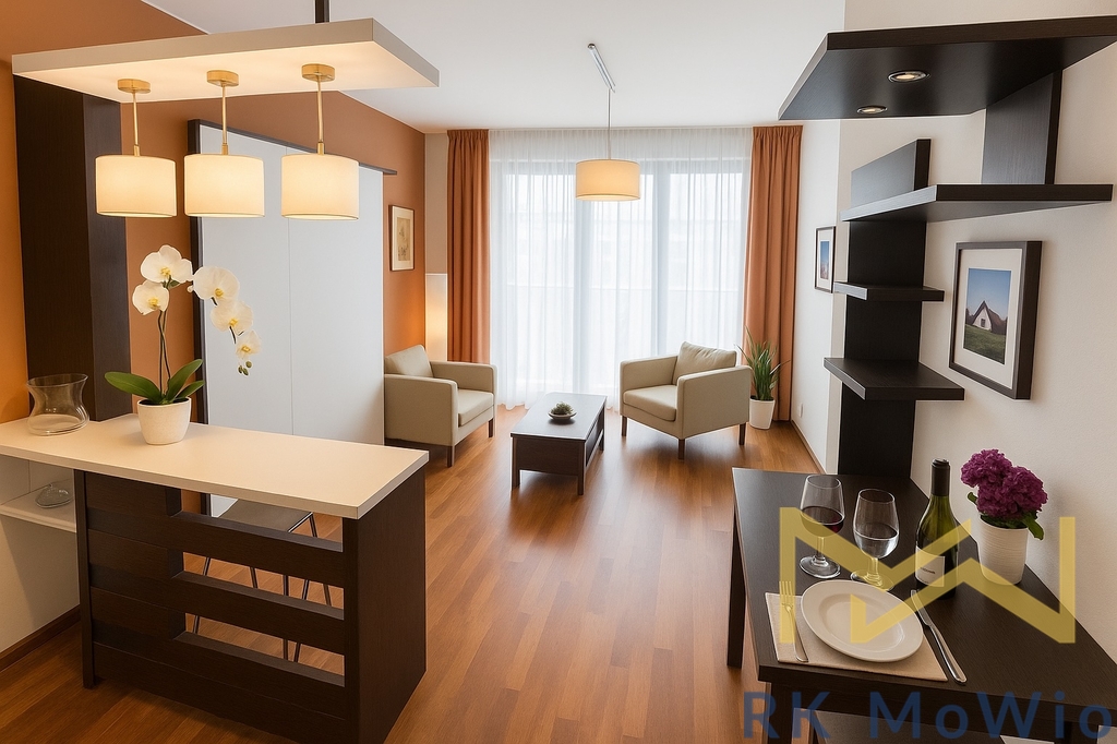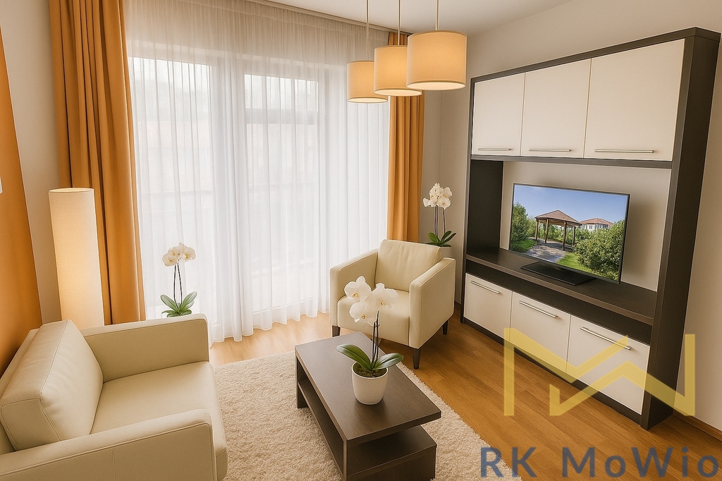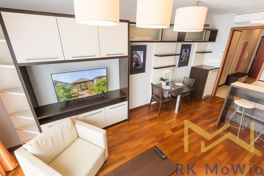 Bytová jednotka nabízí vstupní předsíň, vzdušný obývací pokoj se vstupem na balkón, kuchyňský kout a jídelní prostor, 1 ložnici, 1 koupelnu (se sprchovým koutem a umyvadlem) a samostatnou toaletu. Vybavení bytu: kuchyňská linka (včetně lednice s mrazákem, sklokeramické varné desky, digestoře, myčky, elektrické a mikrovlnné trouby), vestavěné skříně, pračka, příprava pro vysokorychlostní internet, dřevěné podlahy a dlažba. Možnost pronájmu garážového stání za extra příplatek. Fotky jsou ilustrativní.