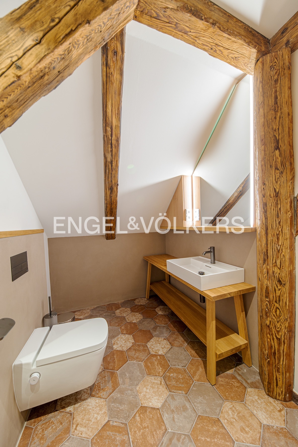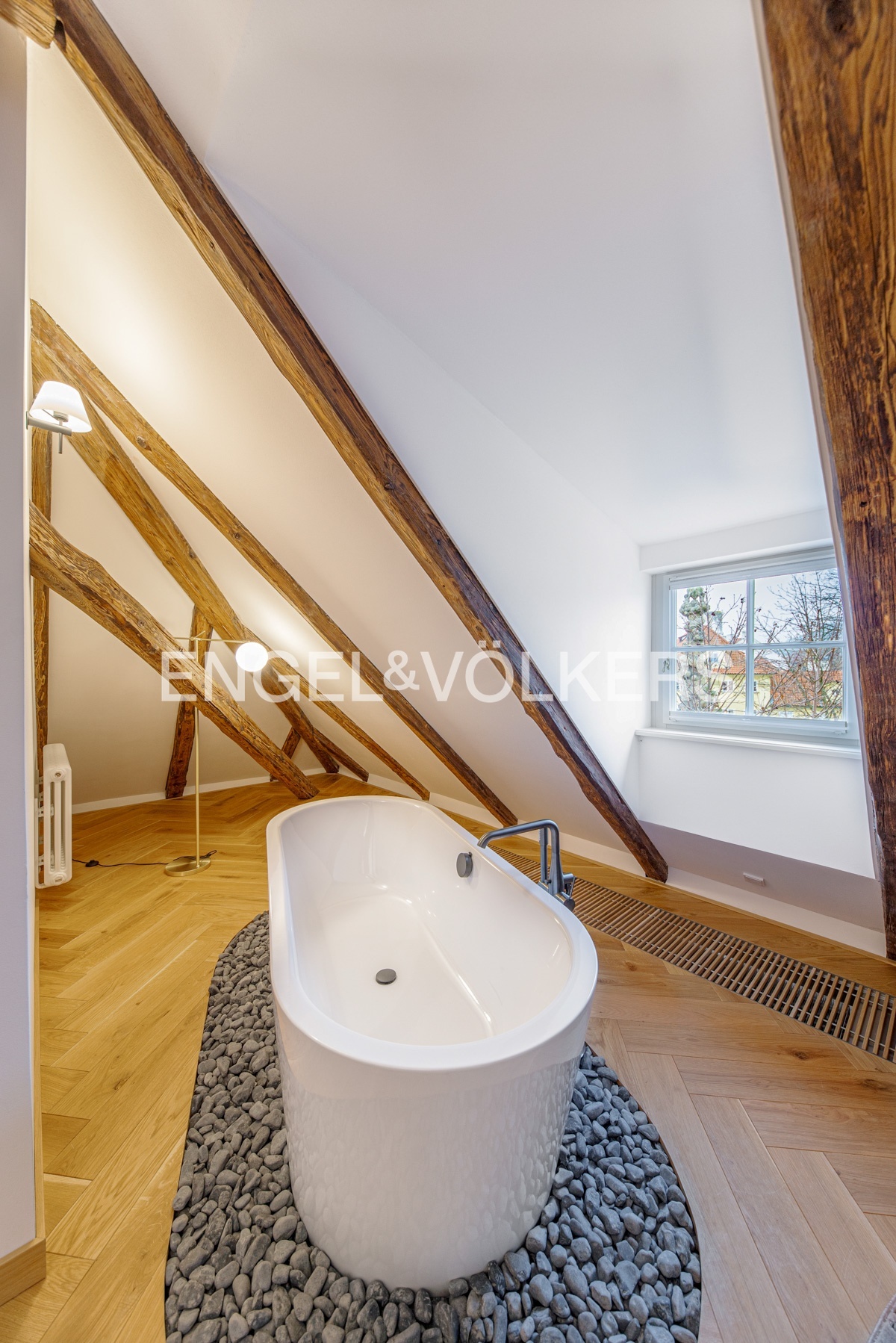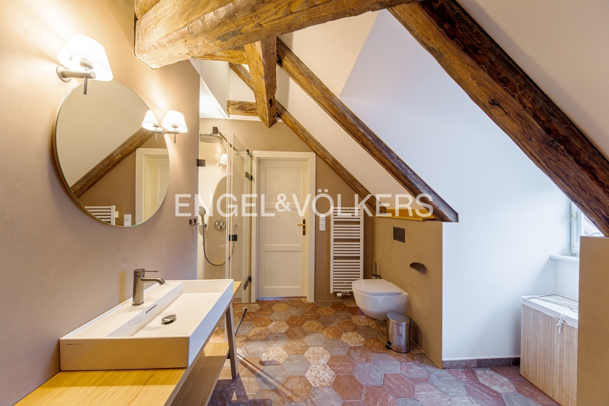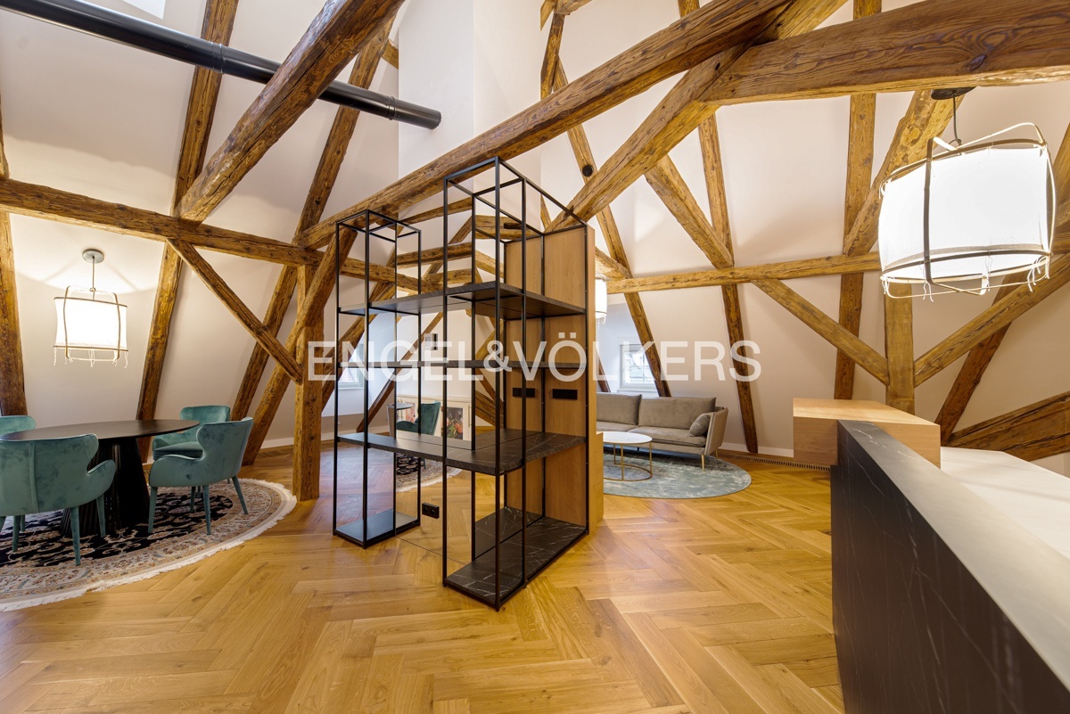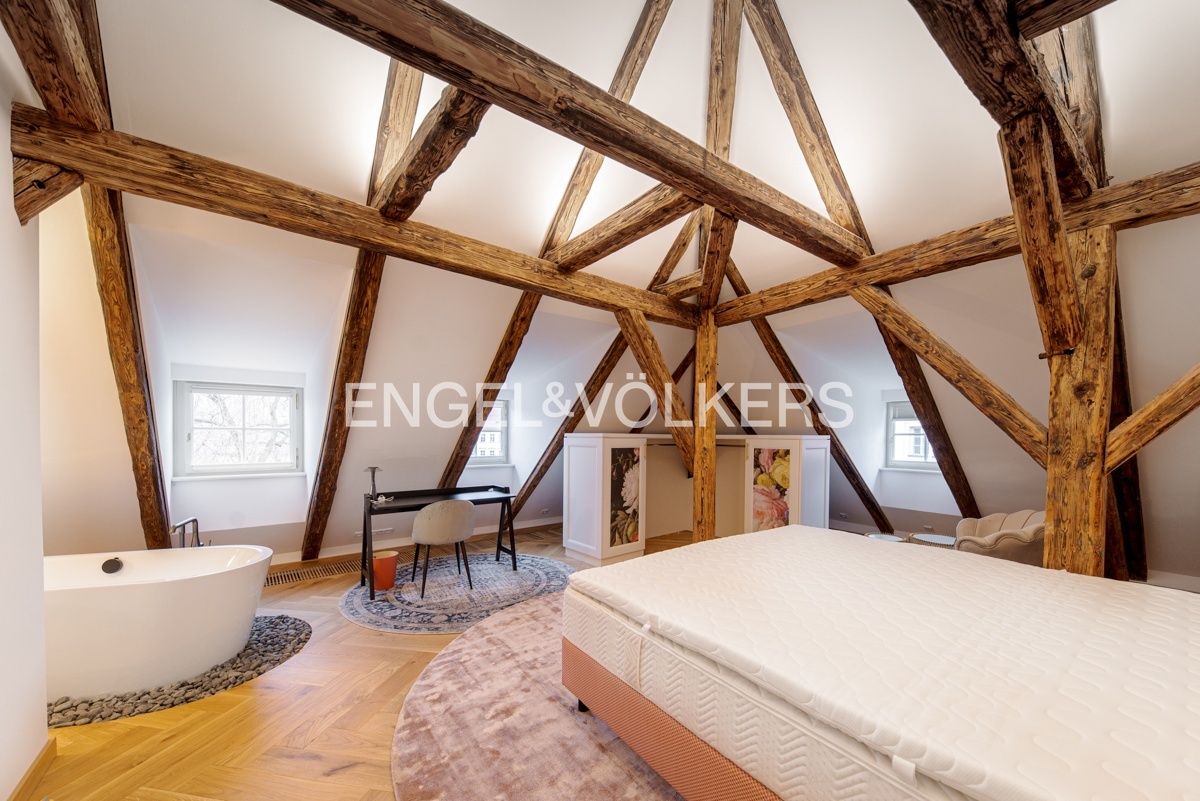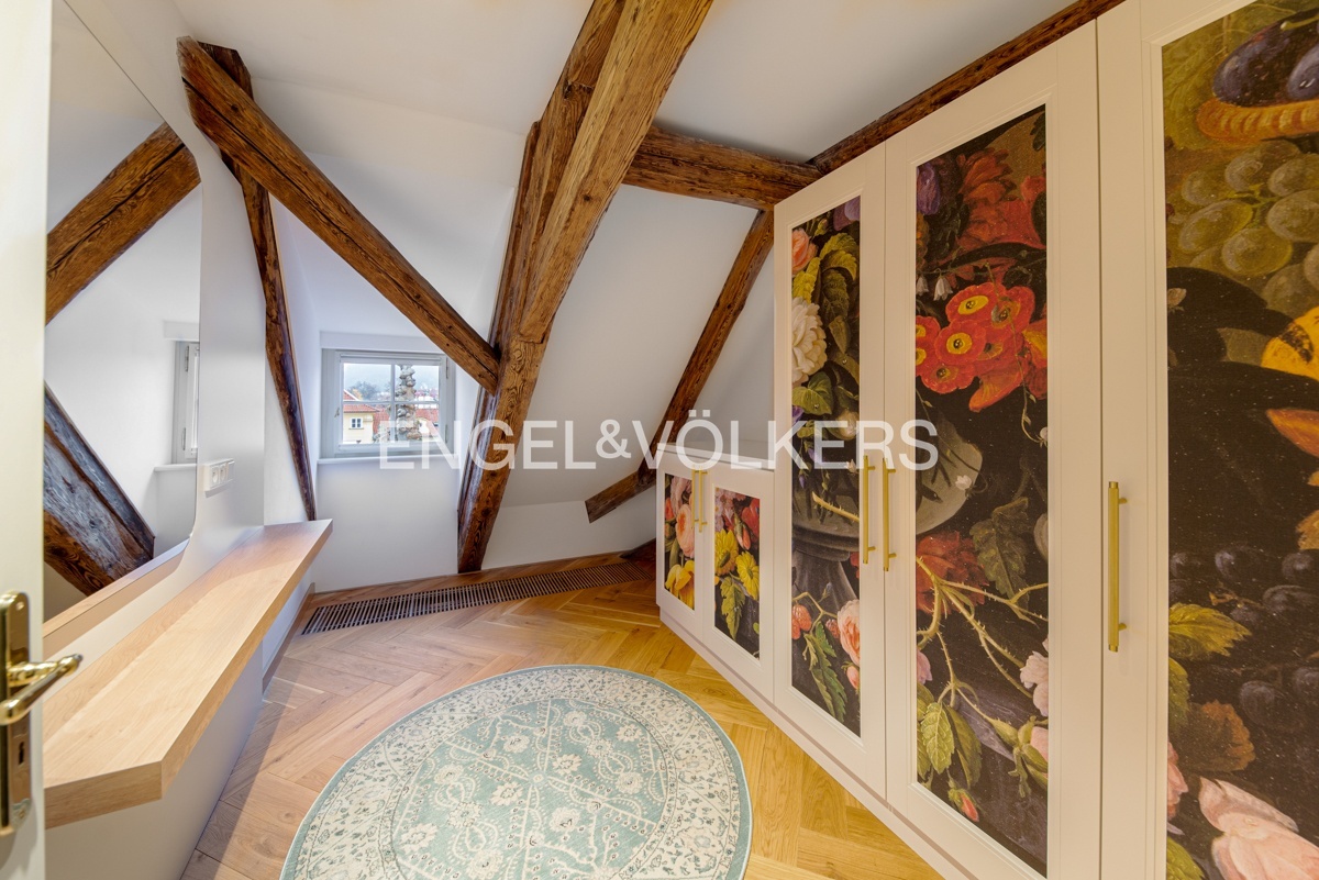 Unikátní dispozice se samostatnou ložnicí s vestavěnou skříní a en-suite koupelnou, krásnou samostatně stojící vanou s výhledem na Petřín, velkorysým obývacím pokojem, kuchyní, technickou místností a hostovskou toaletou a šatnou.